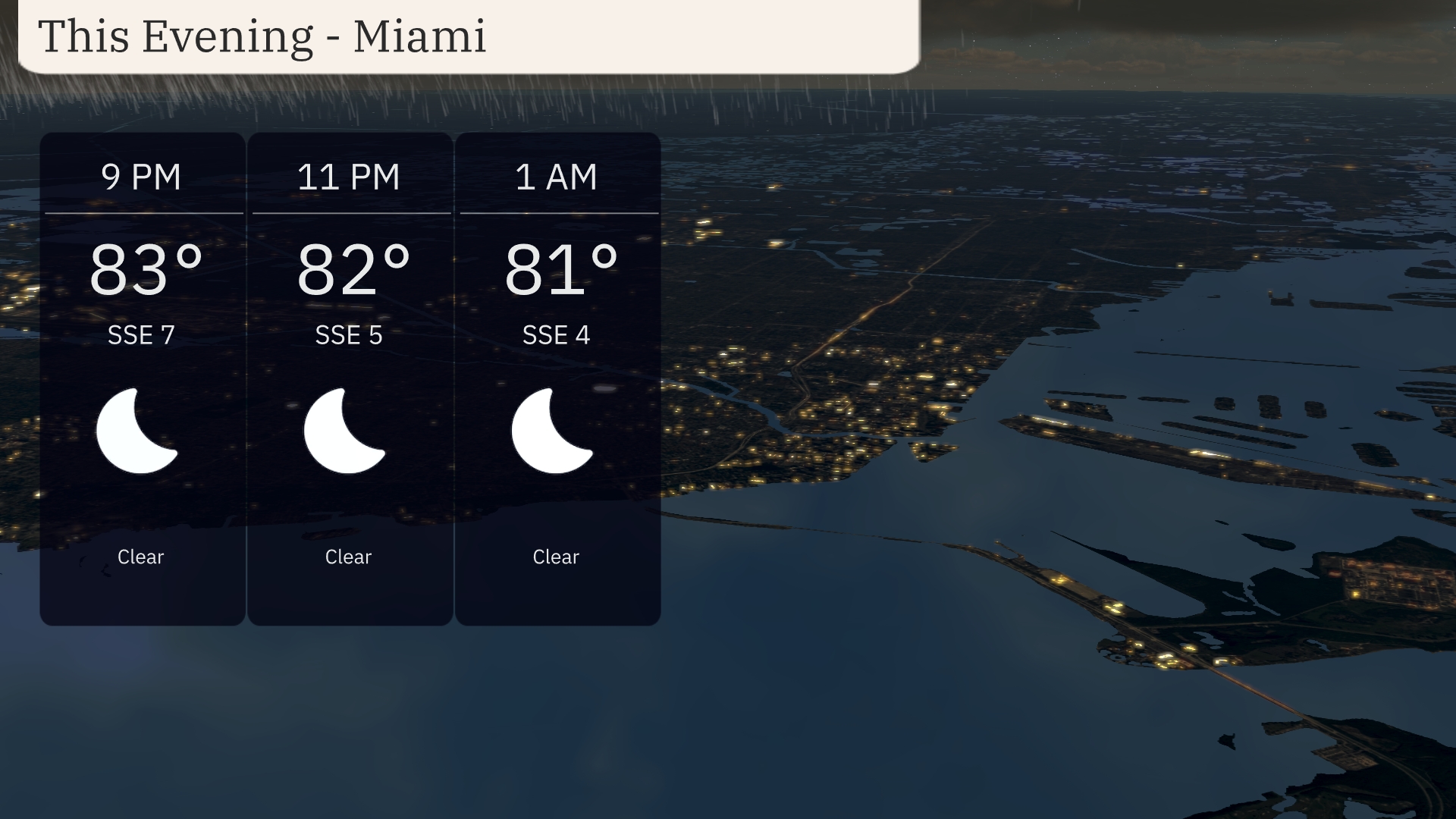 This evening in Miami, expect clear skies with temperatures gradually decreasing from 83 degrees at 9 PM to 81 degrees by 1 AM. Winds will be coming from the south-southeast, starting at 7 mph and calming to 4 mph.