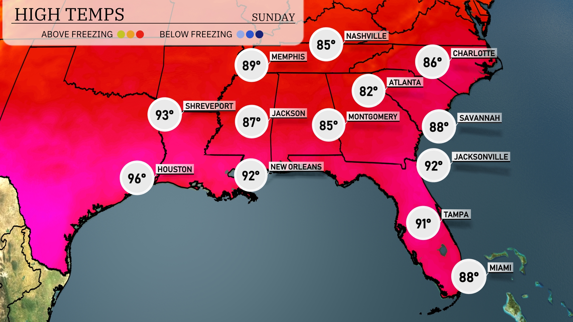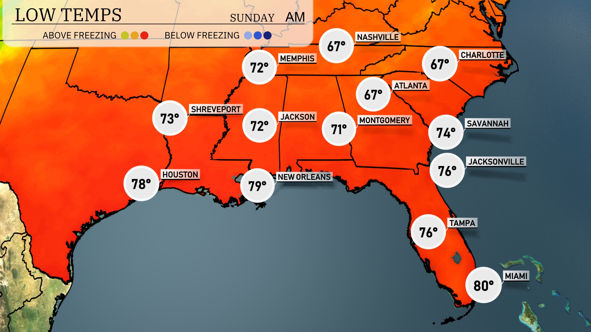 Tonight, temperatures will dip to 67 degrees in Nashville and 71 in Montgomery. Jackson will see a low of 72, while Shreveport drops to 73. Atlanta will also cool down to 67 degrees. Expect mild temperatures in the Southeast with lows generally above 70 in most areas.