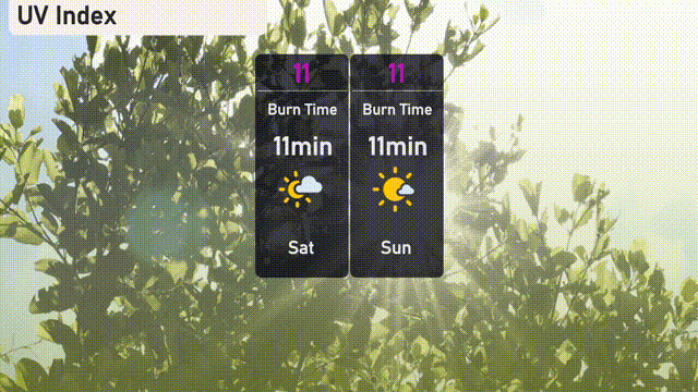 The UV index in Miami will be extremely high at 11 on both Saturday and Sunday. Protective measures are crucial as burn time is approximately 11 minutes in direct sunlight.