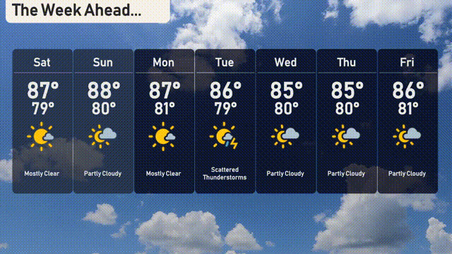 For the 7-day forecast in Miami: Saturday: Mostly clear skies with a high of 87 degrees and a low of 79 degrees. Sunday: Enjoy partly cloudy conditions, with temperatures reaching 88 degrees during the day and dropping to 79 degrees overnight. Monday: Mostly clear again, with a daytime high of 87 degrees and a low of 81 degrees. Tuesday: Watch for scattered thunderstorms, bringing highs around 86 degrees and lows near 79 degrees. Wednesday: Partly cloudy skies will prevail, with temperatures peaking at 85 degrees and dipping to 80 degrees. Thursday: Another partly cloudy day, expect highs of 85 degrees and lows of 80 degrees. Friday: Wrapping up the week with partly cloudy conditions and temperatures reaching 86 degrees, cooling to 81 degrees at night.