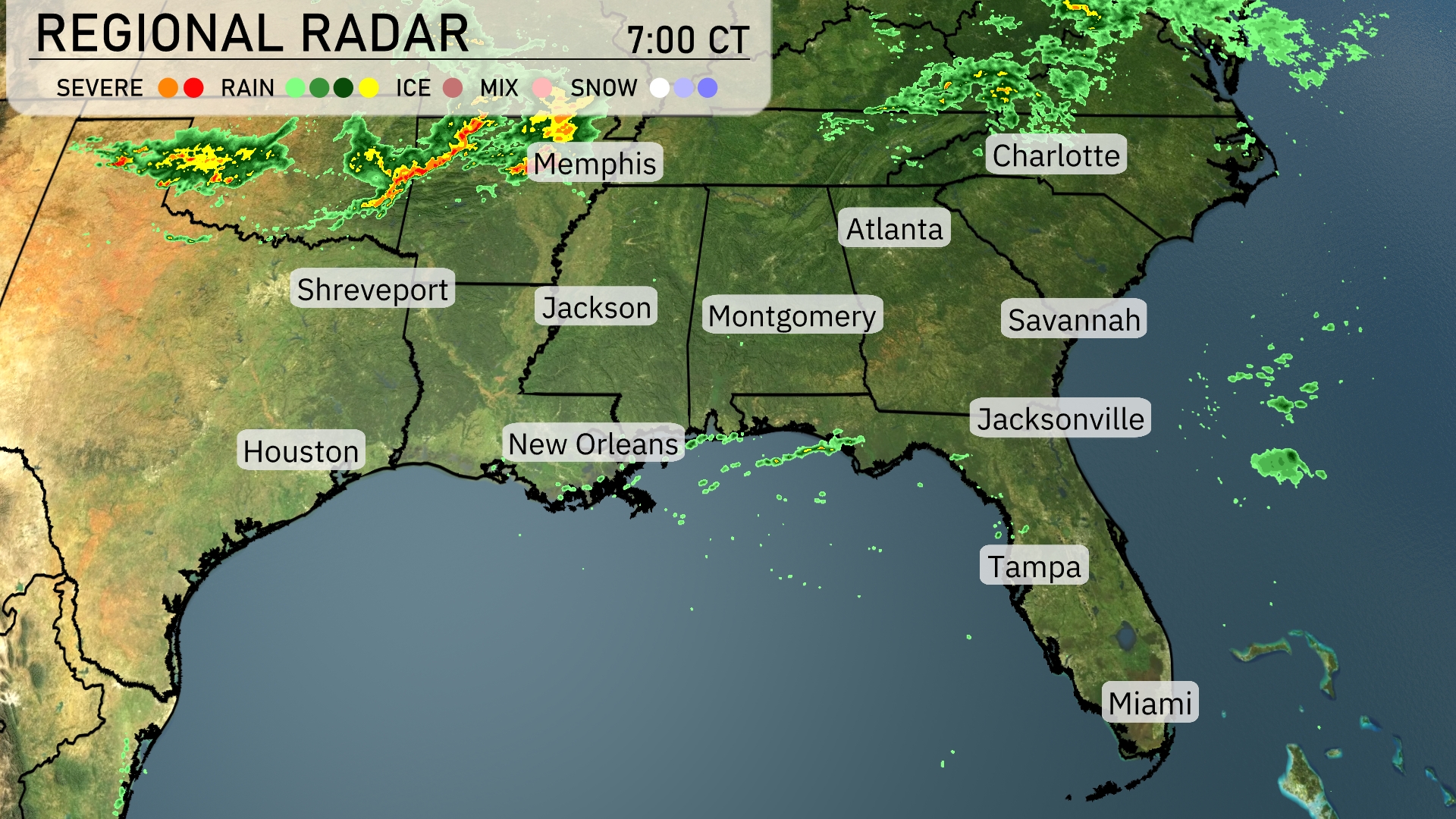 A line of thunderstorms is advancing across Northern Mississippi heading towards Memphis, bringing potentially severe weather. Meanwhile, light rain is dipping into areas around Montgomery, Alabama, and creeping towards Atlanta, Georgia. The region from New Orleans to northern Florida, including Jacksonville and Tampa, remains mostly clear with just a few scattered clouds, maintaining calm conditions.
