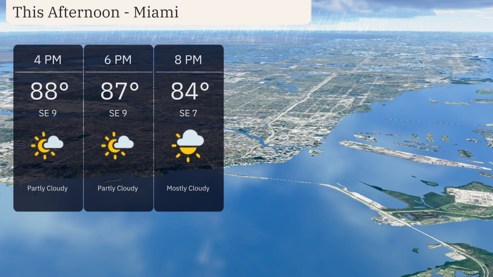 This afternoon in Miami, temperatures will hover around 88 degrees at 4 PM, cooling slightly to 87 degrees by 6 PM, and further to 84 degrees by 8 PM. Expect a partly cloudy sky initially, transitioning to mostly cloudy by the evening. Winds will remain gentle from the southeast direction at around 9 miles per hour, easing to 7 miles per hour late into the afternoon.
