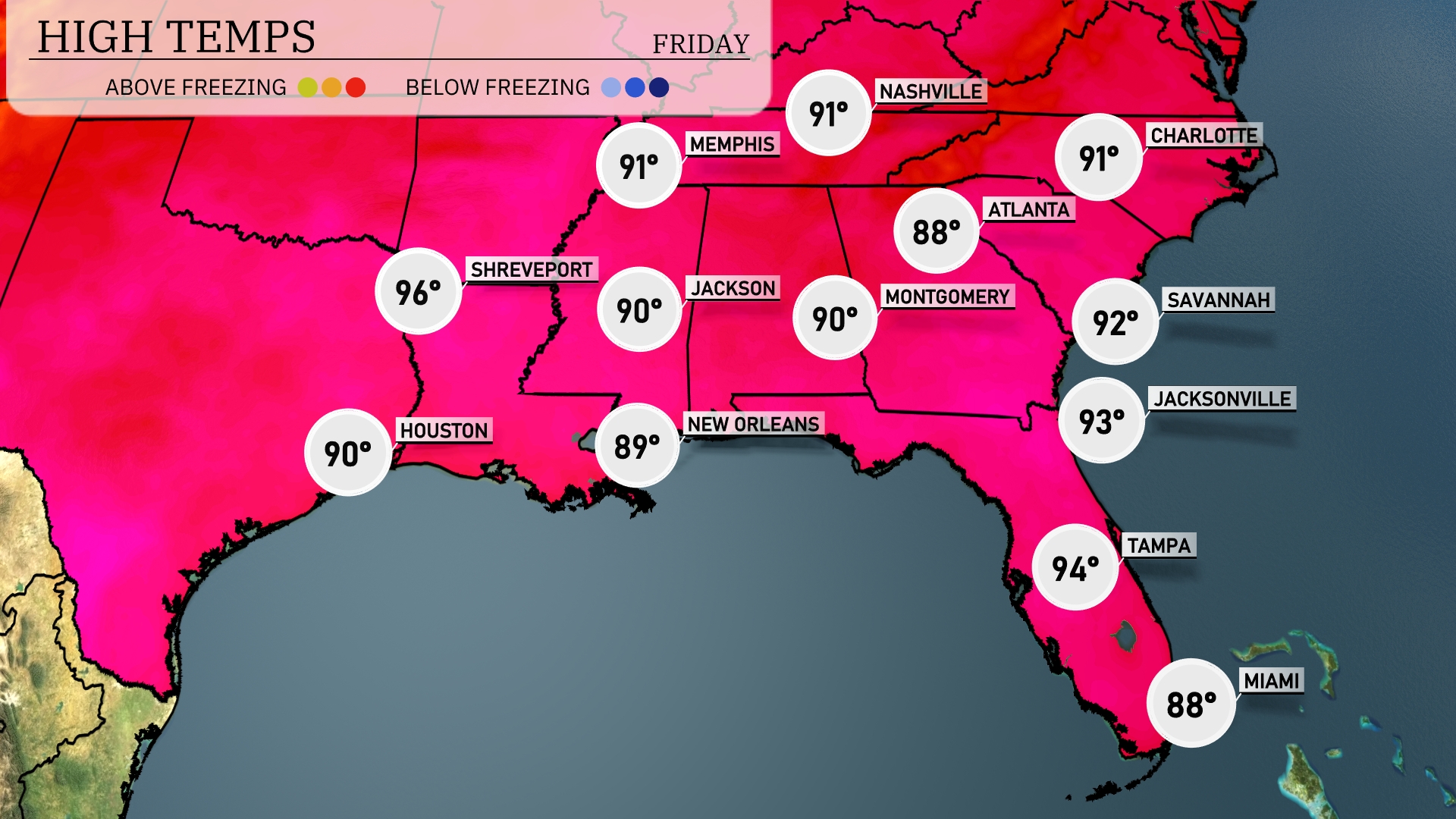 In the Southeast today, we’re seeing a range of warmer temperatures across the region. Jacksonville and Savannah are both hitting a high of 91 degrees, while Miami is a bit cooler at 88. Over in New Orleans, expect temperatures to reach 87 degrees, and in Jackson, we’re forecasting a high of 87 as well. Montgomery is slightly warmer today at 90 degrees, while Atlanta comes in at 85. It’s important to stay hydrated and be mindful of the heat, especially in these areas today!