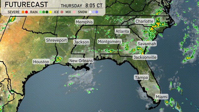 A weather system is driving showers and thunderstorms into the Southeast from Louisiana to Georgia, including parts of Florida. Expect storms with heavy rain and localized flooding risks especially from Jackson to Jacksonville through Friday morning. A cold front stalls in the region, maintaining cloudy and damp conditions with cooler temperatures hovering in the mid-70s. Thunderstorms could produce gusty winds and brief downpours, especially through Alabama and Mississippi. The unsettled weather pattern holds through Friday evening, clearing up slightly by Saturday morning.