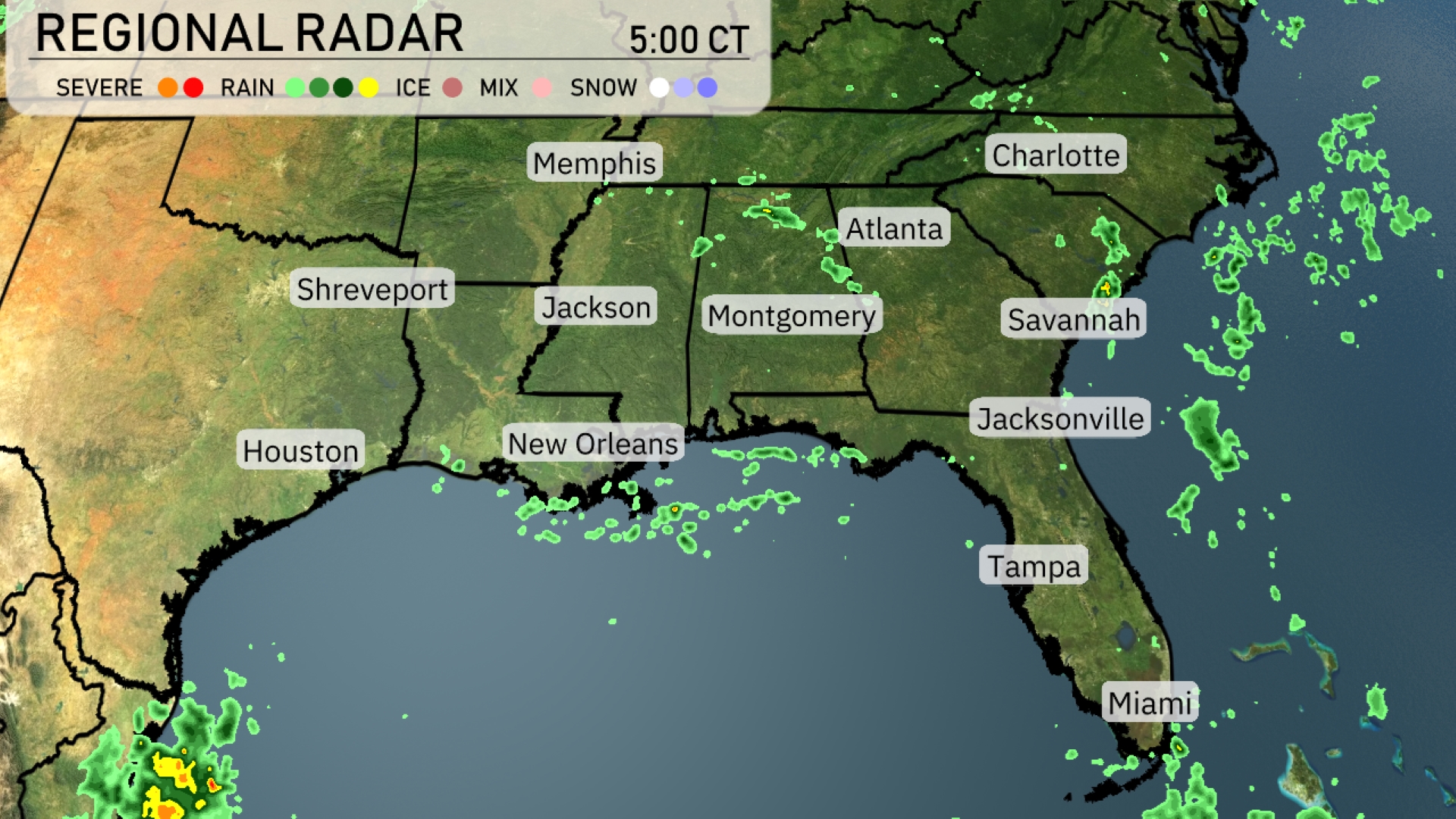 Tonight, temperatures are expected to dip to 72 degrees in Memphis and Nashville. Jackson will see a low of 72, while Montgomery dips to 73. Shreveport will stay warmer at 77 degrees, along with New Orleans also holding steady at 77. Expect mild conditions in the coastal cities, with Tampa at 76 and Miami remaining warm at 81 degrees.