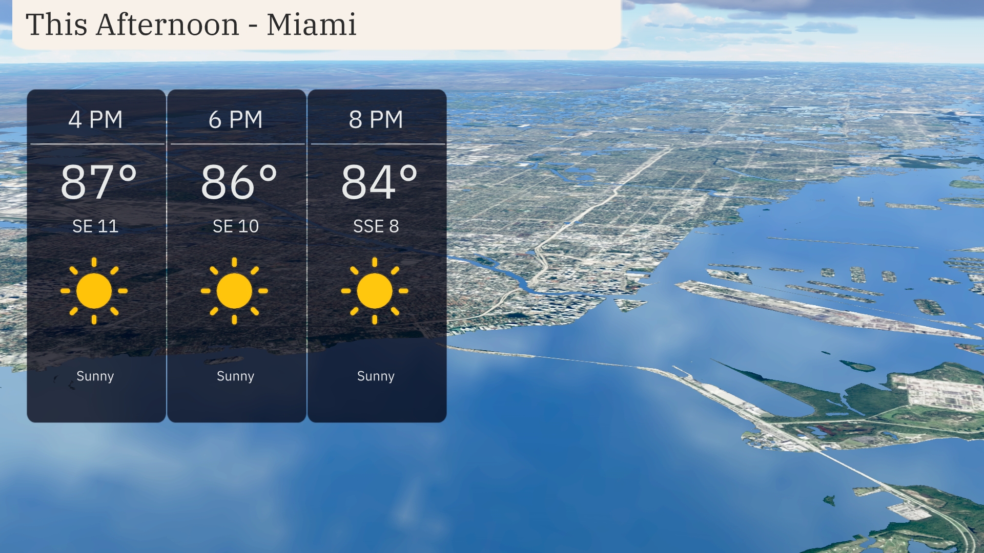 In the afternoon hours in Miami, temperatures will reach up to 87 degrees by 4 PM, maintaining a sunny outlook. Expect a light southeast wind blowing at 11 mph, creating a pleasant breeze. By 6 PM, temperatures slightly drop to 86 degrees with winds continuing southeast at 11 mph. Sunny skies persist into the evening, with temperatures easing to 84 degrees and winds shifting to south-southeast at 8 mph.