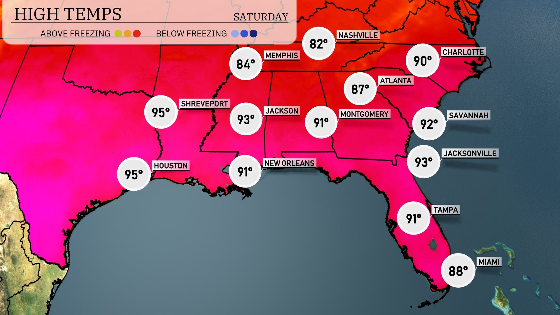 This afternoon, temperatures are heating up across the Southeast. In Shreveport and Houston, we’re looking at highs of 95 degrees, making it one of the hottest spots in the region. Jackson is slightly cooler at 93 degrees, while both New Orleans and Montgomery will see highs around 91 degrees. Moving east, Jacksonville is expected to hit 93, and Savannah will be just a touch warmer at 92 degrees, with Atlanta not far behind at 90. Miami remains milder with a high of 88 degrees, showcasing a bit of a temperature contrast compared to its northern neighbors.