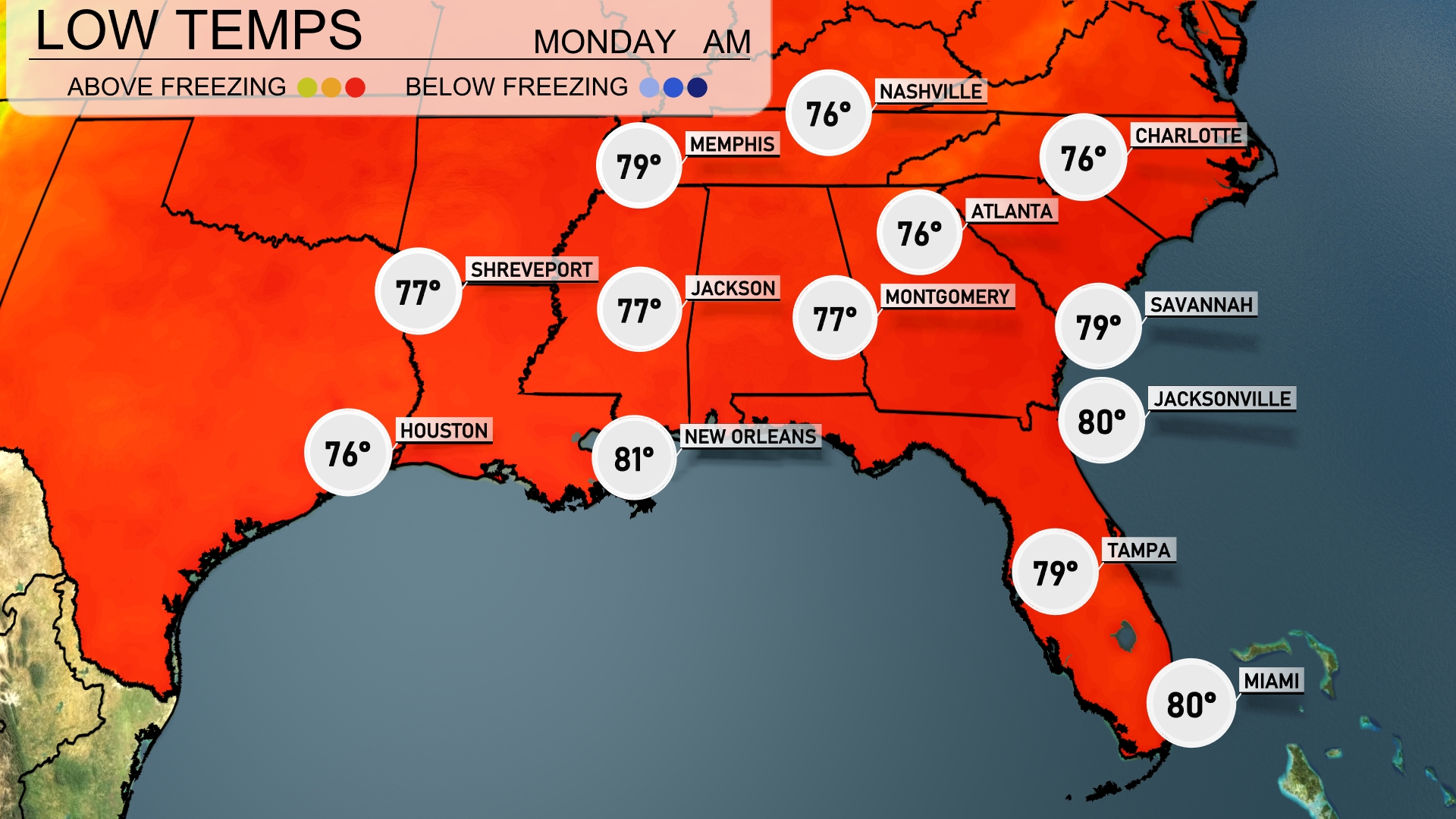 Tonight, temperatures in the Southeast will remain warm, with Memphis experiencing a low of 79 degrees. Jackson will also see a low of 77 degrees, while Shreveport drops slightly to 77 as well. New Orleans will be a bit warmer at 81 degrees. Expect Jacksonville to hit 80 degrees, making for a mild night across the region.