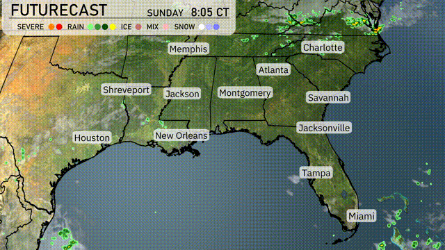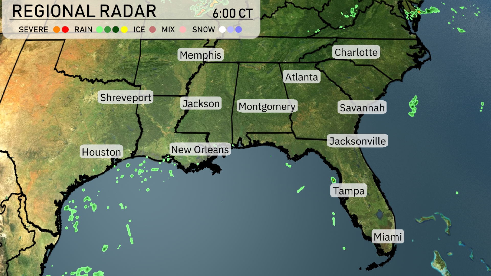The radar shows clear skies across much of the Southeast, with scattered showers detected over the Gulf waters near New Orleans, which may bring some light rain along the coastal areas. Memphis and Atlanta remain dry under clear conditions, enjoying a sunny day. Jacksonville and Miami are experiencing some patchy clouds, but no significant precipitation is expected. Charlotte and the surrounding Carolinas continue to enjoy clear and calm weather.