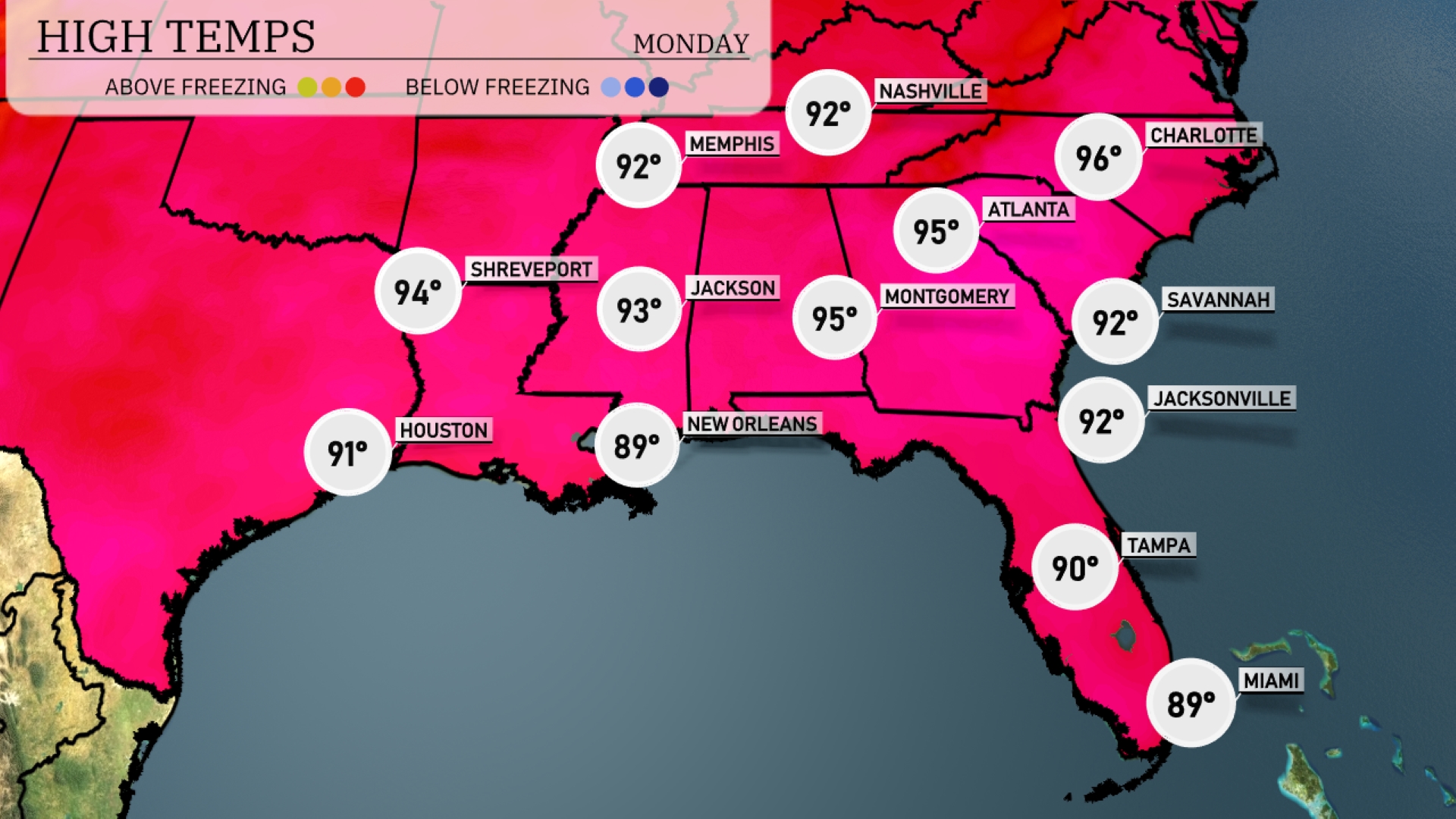 Tonight, temperatures in the Southeast will remain mild, with Shreveport dipping to a low of 76 degrees. Jackson will see a low of 72, while Nashville will cool down to 74. Expect 77 degrees in Savannah, and 76 in Jacksonville. Miami will stay warm at 79 degrees, but will still be about 10 degrees cooler than recent nights.