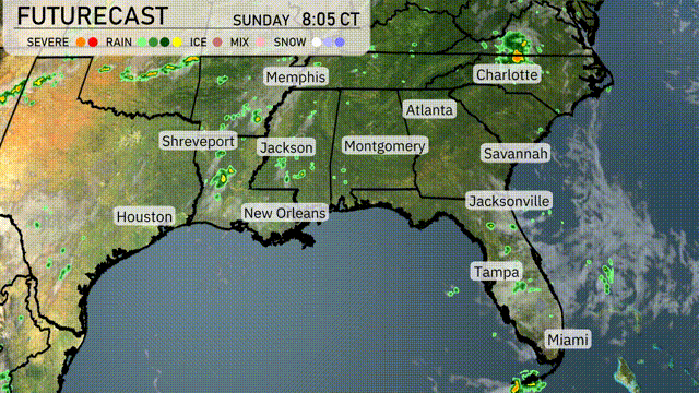 A frontal system is developing across the Southeast, bringing scattered thunderstorms, particularly from Shreveport to Atlanta. These storms may produce heavy rain and gusty winds, especially overnight heading into Monday morning. By midday Monday, expect showers extending from Jackson to Montgomery, potentially affecting travel plans. Brief periods of heavy rainfall may lead to localized flooding, so stay alert for any advisories. Temperatures will remain warm, gradually cooling slightly behind the front, with clearer skies expected by late Monday afternoon.