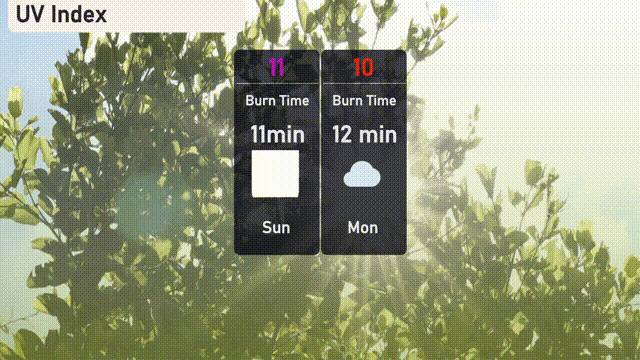 The UV index in Miami today will be very high at 11, with a dangerous burn time of only 11 minutes—make sure to wear sunscreen and protective clothing. On Monday, the index remains high at 10, reducing the burn time slightly to 12 minutes due to some cloud cover. Stay sun-safe, and seek shade when possible!