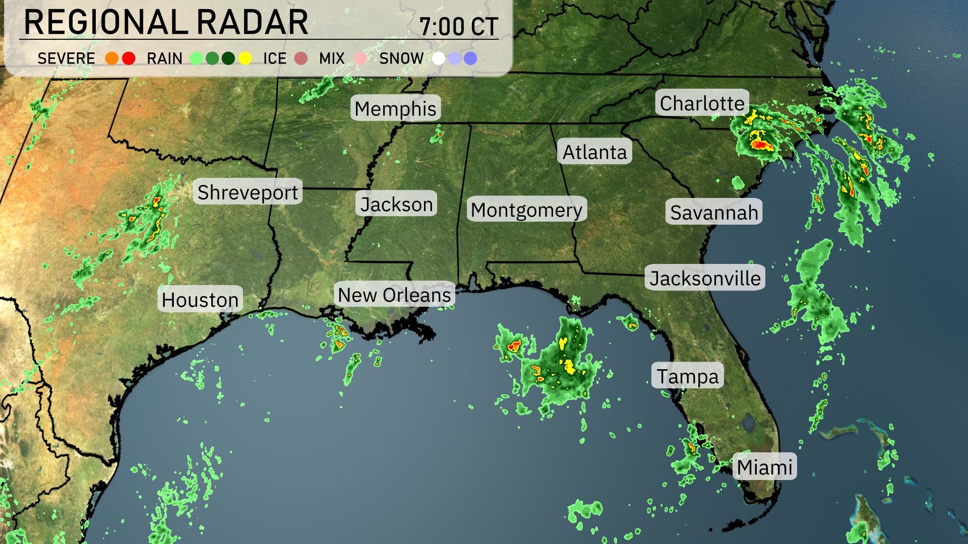 Storms are forming along the Georgia coast, with intense rainfall just near Savannah moving northeast towards Charleston. Meanwhile, widespread showers are moving across the Gulf Coast from Tampa to New Orleans, bringing increased cloud cover and wet conditions. Showers are developing around New Orleans, with potential for heavier rainfall. Elsewhere in the region, skies remain mostly clear, keeping conditions calm in places like Houston and Charlotte.