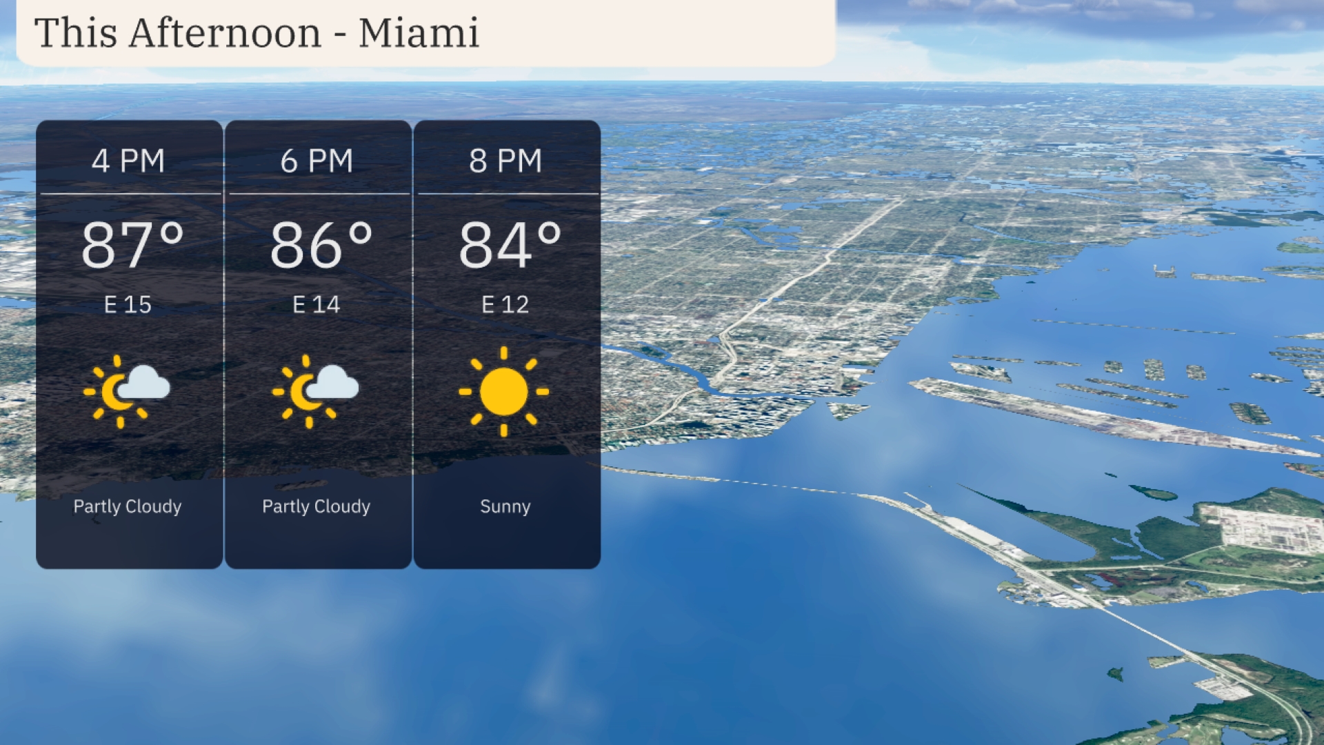 Miami’s afternoon will see temperatures reaching 87 degrees by 4 PM, accompanied by an easterly wind at 15 miles per hour. By 6 PM, it’s cooling slightly to 86 degrees with clouds moving in. As the sun sets around 8 PM, expect clear skies and a pleasant 84 degrees with winds calming to 12 miles per hour.
