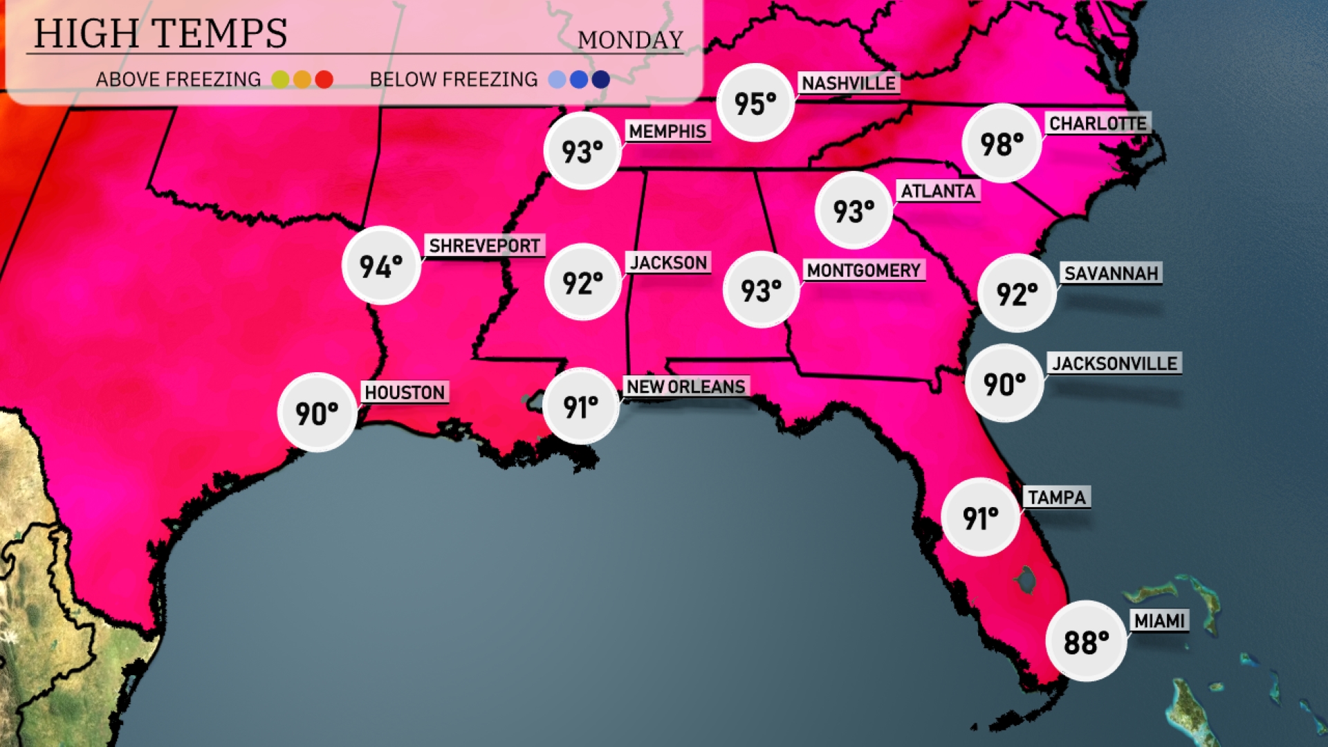 Afternoon high temperatures across the Southeast are shaping up to be quite warm today. In Atlanta, we’re looking at a high of 98 degrees, making it one of the hottest spots in the region. Memphis will reach 95 degrees, while Montgomery and Jackson are both forecasted to hit 93. New Orleans is slightly cooler at 91 degrees, and over in Tampa, expect a high of 91 degrees with coastal breezes bringing some relief. Miami is on the mild side today, with a high of 88 degrees.