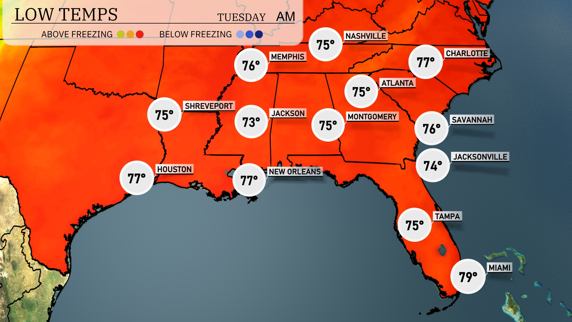 Tonight, Memphis will see a low of 76 degrees, while Nashville cools to 75. In Jackson, expect a low of 73, and Montgomery will drop to 75 degrees. Atlanta will be slightly cooler at 75 degrees, and Jacksonville is forecasted to dip to 74.