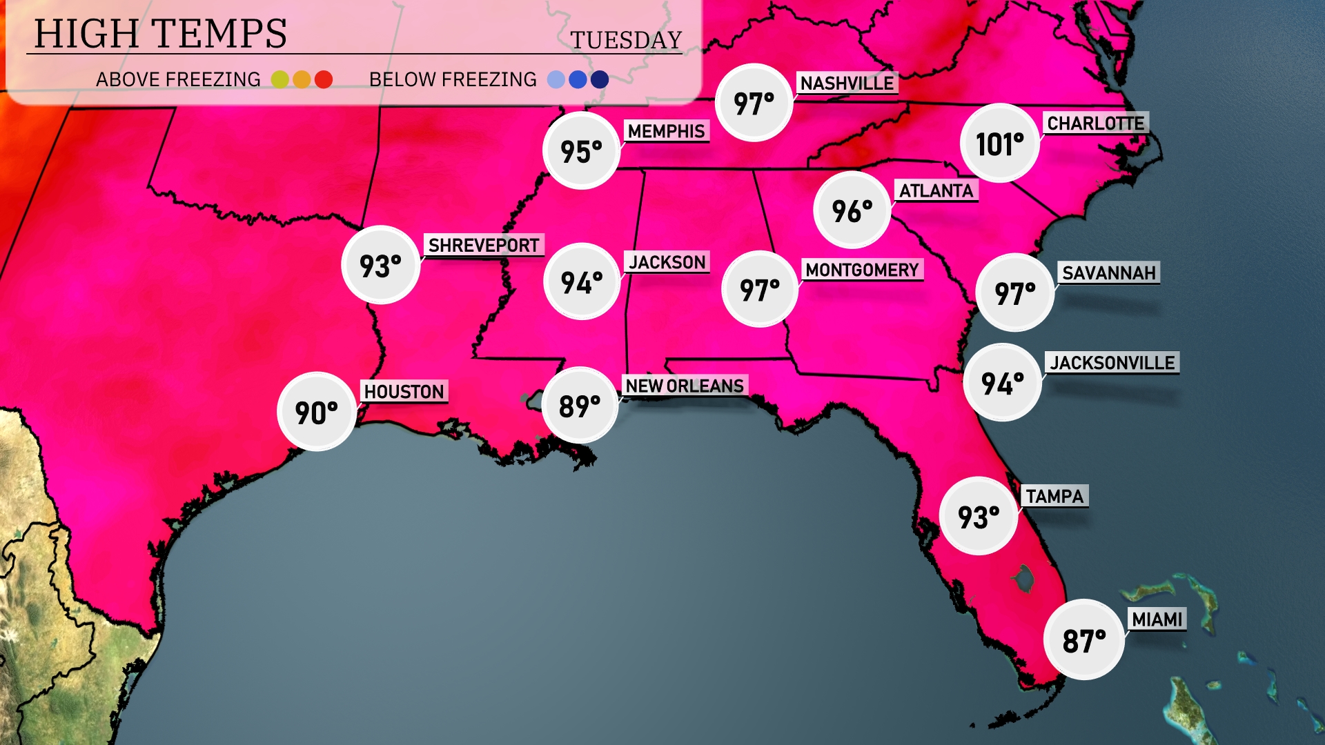Tomorrow, Atlanta will experience a high of 96 degrees, a notable above-average reading for this time of year. In Montgomery, expect similar heat, with temperatures reaching 97 degrees. Over in Jacksonville, temperatures will hit 94 degrees, while Tampa sees a slightly cooler 93 degrees. Savannah will also feel the heat with a high of 97 degrees, tracking closely with regional trends. New Orleans rounds out the Southeast with a high of 89 degrees, influenced by nearby moisture and humidity patterns.