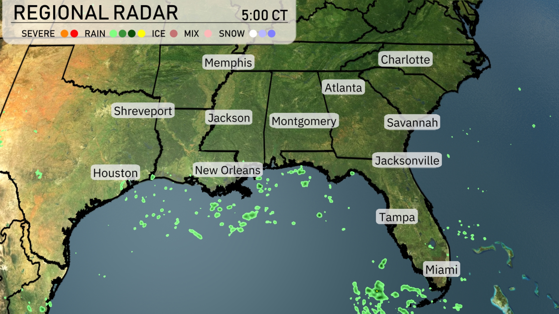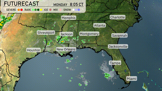 This week in Miami and the Southeast, expect a mix of sunny skies and potential storms. With temperatures peaking at 88°F and a high UV index, it’s crucial to stay sun-safe. As the week progresses, watch for thunderstorms, especially from Tuesday, bringing cooler temperatures and possible severe weather impacts. Stay updated and prepared with our comprehensive weather insights. A strong system of severe storms stretches across the Gulf Coast, impacting New Orleans with heavy rain and thunderstorms. Beyond this, scattered rain showers spread across coastal Texas, including Houston, and southeastern Louisiana, moving eastward. Clouds are gathering over central Mississippi, while areas like Montgomery and Atlanta remain under clear skies for now. The remainder of the Southeast, including Memphis and Charlotte, enjoys dry conditions with generally clear skies, but the presence of nearby systems suggests a shift towards more active weather.