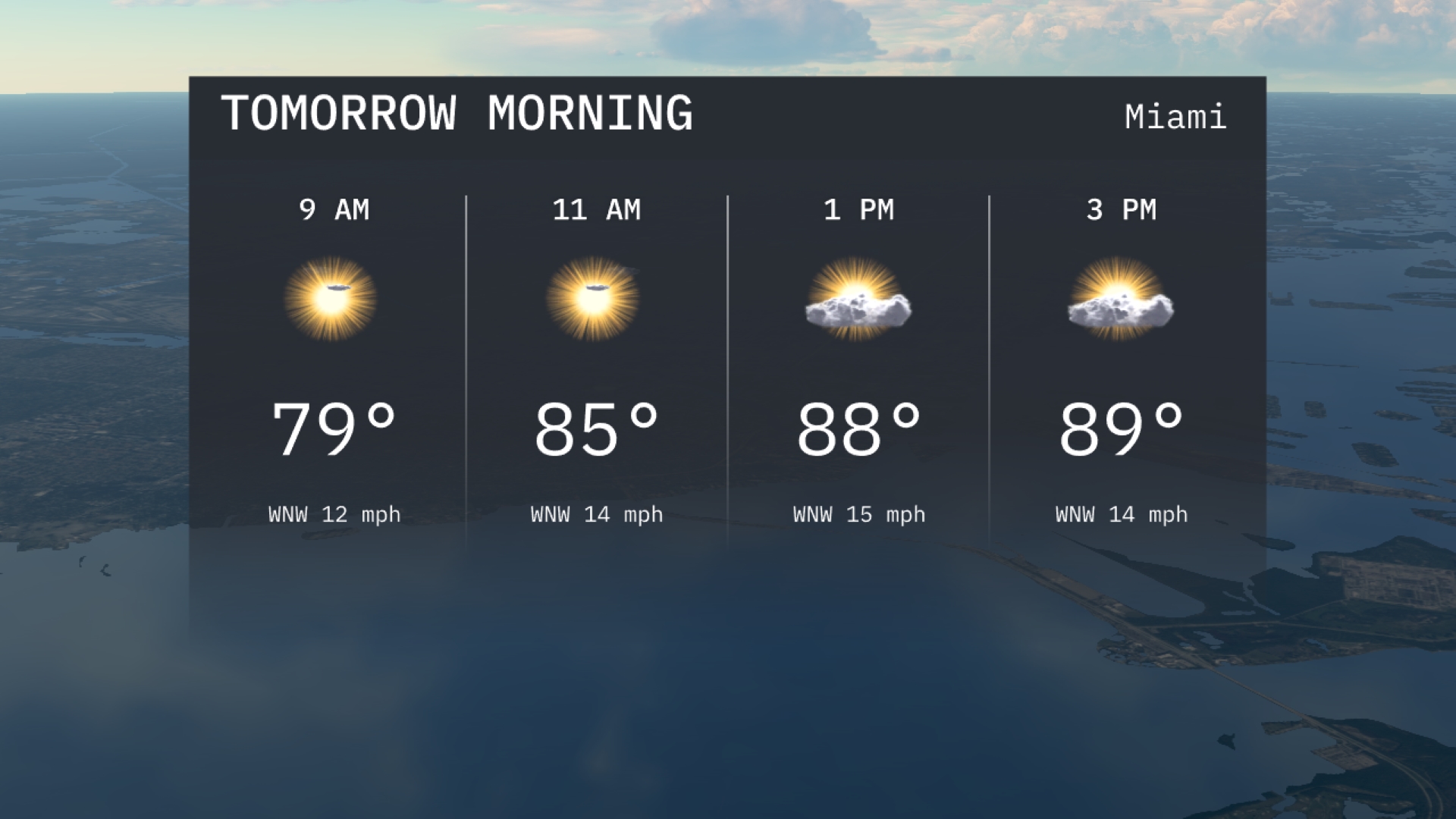 Tomorrow morning in Miami begins with a warm 79 degrees at 9 AM, with sunshine dominating the sky. The temperature rises to 85 degrees by 11 AM, as a light WNW breeze of 14 miles per hour keeps the air feeling fresh. Expect sunny conditions continuing mid-morning, perfect for outdoor activities.