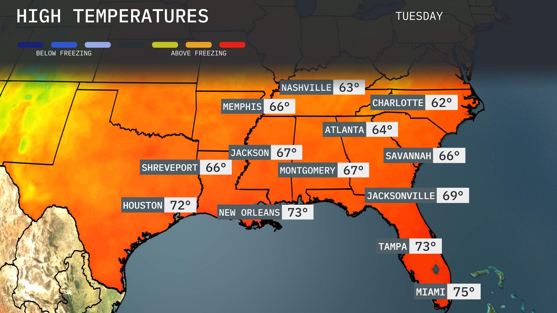 Tomorrow, Atlanta can expect a high of 64 degrees. Montgomery will see temperatures reaching 67, while Jackson also warms up to 67. In New Orleans, the forecast indicates a mild day with highs hitting 73 degrees. Further south, Miami will enjoy the warmest conditions at 75 degrees, signifying above-average temperatures for this time of year across much of the Southeast.