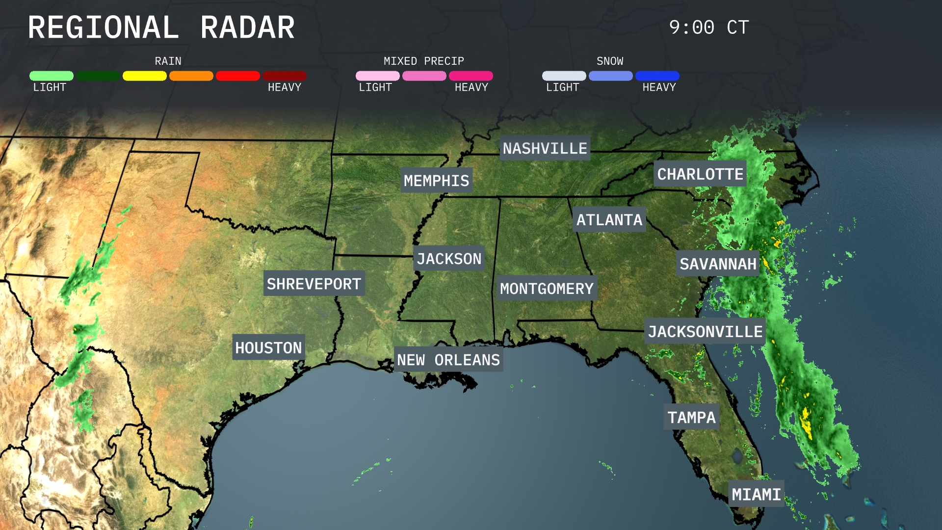 Across the Southeast region, a substantial rain system is sweeping through the coastal areas from Savannah to Miami, bringing heavy precipitation and potential thunderstorms. Jacksonville and Tampa are experiencing moderate rain, with conditions expected to continue as the system progresses inland. Clear skies dominate northwards towards Nashville and Memphis, offering a pleasant break from active weather. Some showers are also approaching the Houston area from the west, which could lead to brief bouts of rain later in the day.
