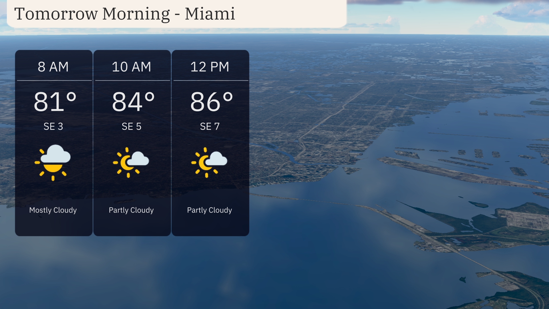 Tomorrow morning in Miami, temperatures will start at 81 degrees at 8 AM and rise to 84 degrees by 10 AM, with a south-east breeze at 5 miles per hour. Expect mostly cloudy skies turning partly cloudy as the morning progresses. By 12 PM, the temperature reaches 86 degrees with winds picking up slightly to 7 miles per hour.
