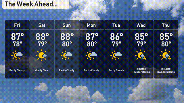 Friday: Partly cloudy with a high of 87 degrees and a low of 78 degrees.