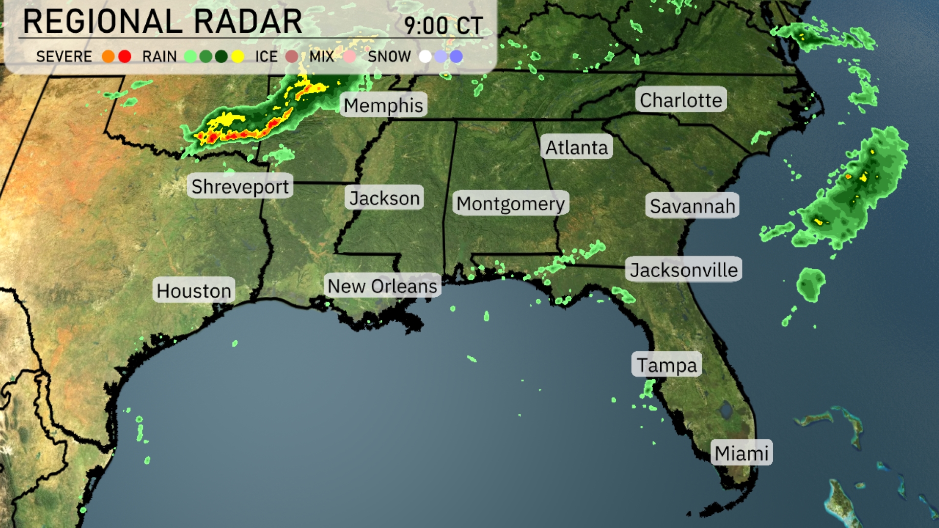 A line of severe storms is currently moving southeast from Shreveport toward Jackson, bringing heavy rain and the potential for strong thunderstorms. Showers are extending into parts of Alabama, particularly near Montgomery, with cloudy skies building over Atlanta. A band of rain is sweeping across the Nashville area, heading eastward. The southern regions, including Miami and Tampa, remain mostly clear under serene conditions.