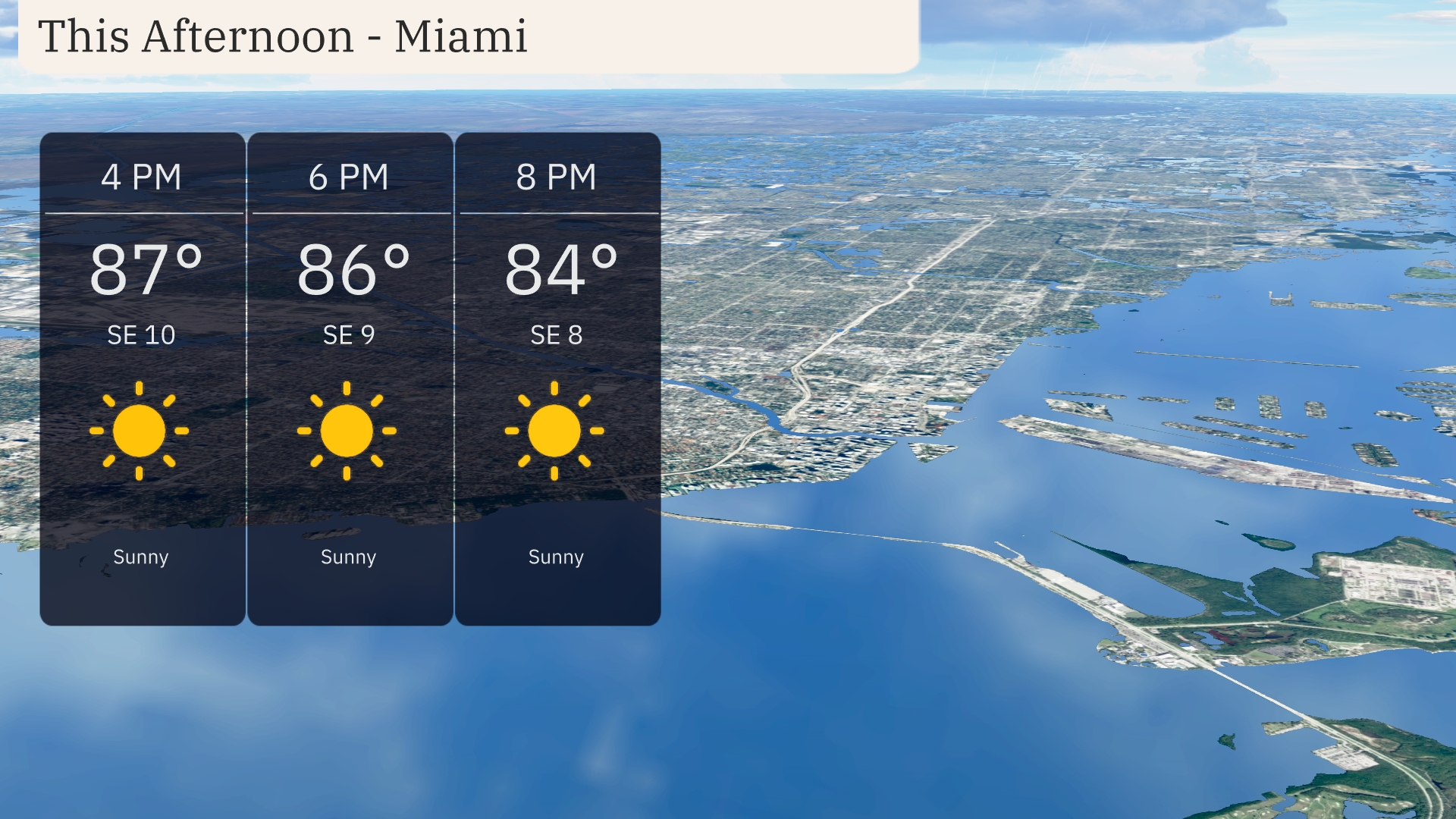 In Miami this afternoon, temperatures will hover around 87 degrees at 4 PM, gradually cooling to 84 degrees by 8 PM. Expect predominantly sunny skies with a gentle southeast breeze, ranging from 10 to 8 miles per hour.
