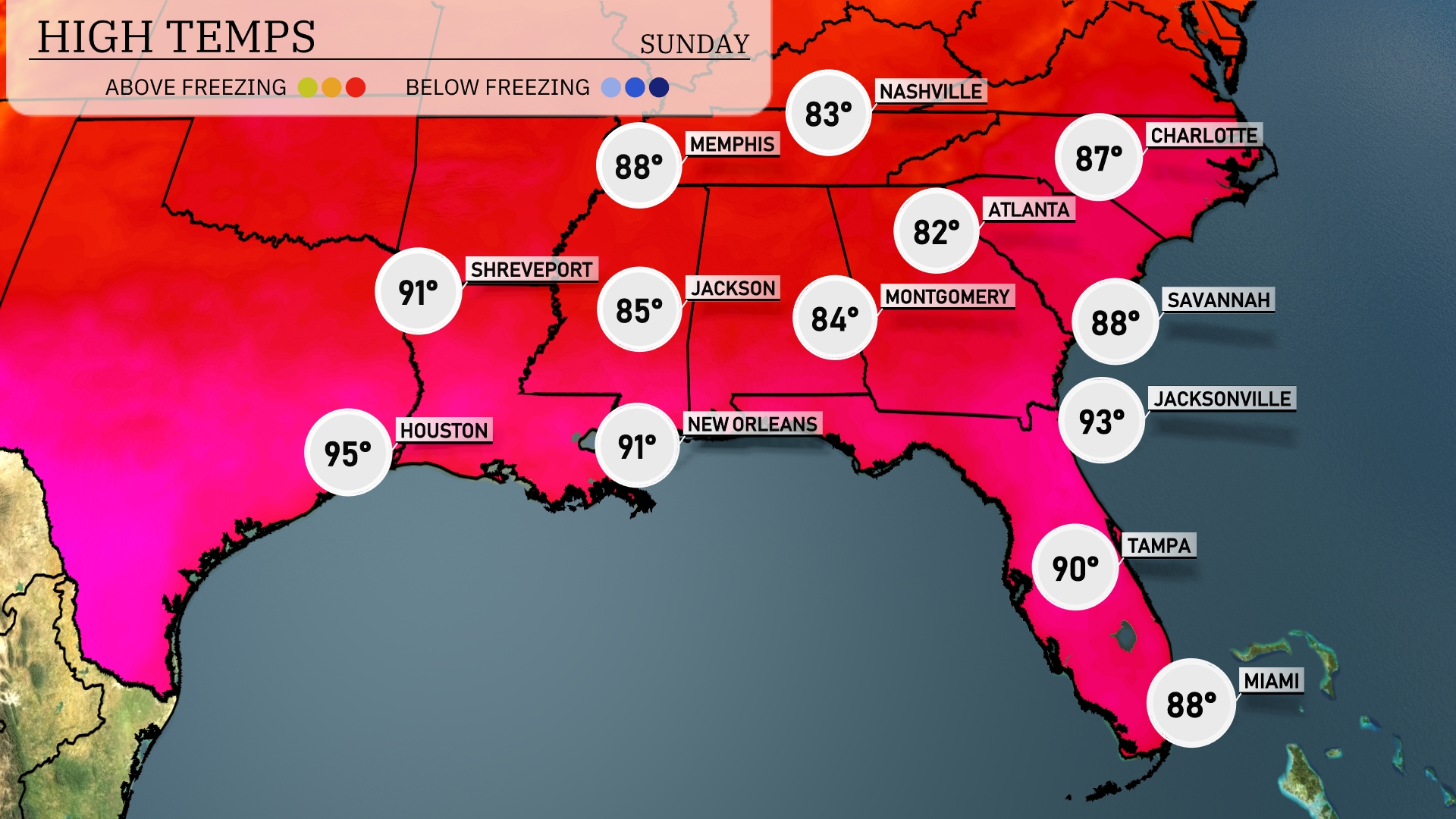 Tomorrow, Atlanta will reach a high of 84 degrees, while Jacksonville sizzles at 92. New Orleans is expected to soar to 91 degrees, indicating a warmer trend across the region. Montgomery will warm up to 84 degrees, and Charlotte will also see a high of 89 degrees.