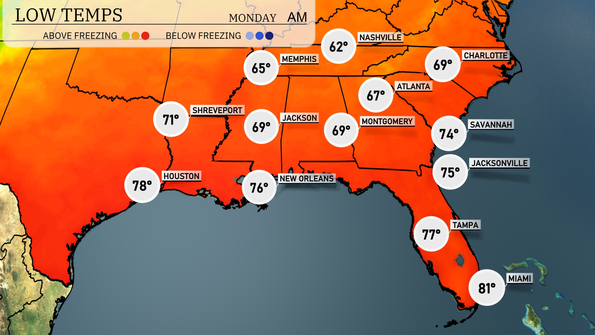 Tonight, Memphis will cool down to 62 degrees, while Nashville will drop to 65. Shreveport is expected to dip to 71 degrees, with Jackson not far behind at 69. Coastal cities like Miami will stay warmer at 81, while Atlanta’s low stands at 67 degrees.