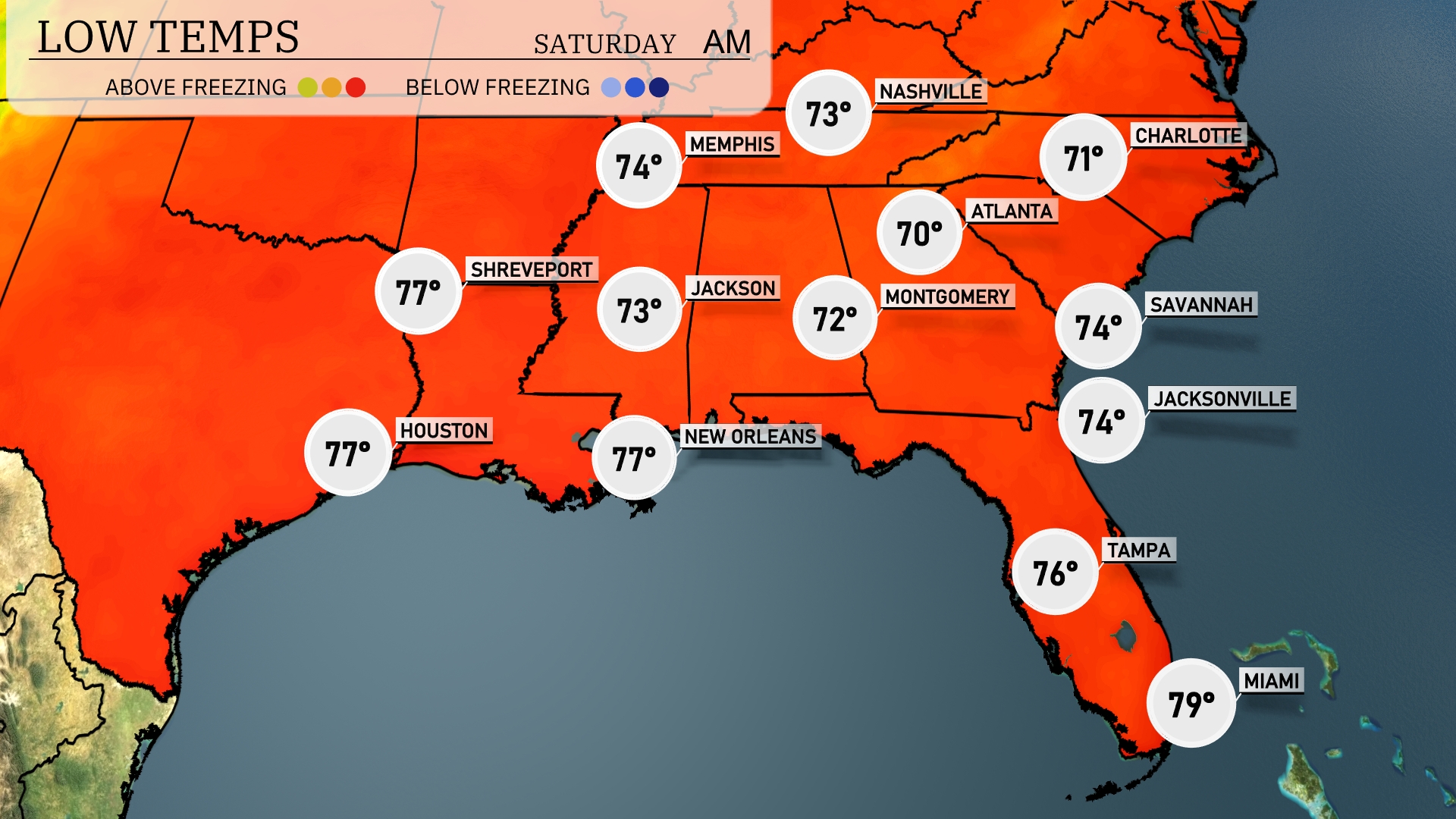 Tonight in the Southeast, temperatures will drop to 70 degrees in Montgomery and 71 in Nashville. Atlanta is expected to cool off to 70 degrees, while Memphis stays a bit warmer at 74. Farther south, New Orleans will see lows around 77 degrees, with Tampa remaining at a mild 76.