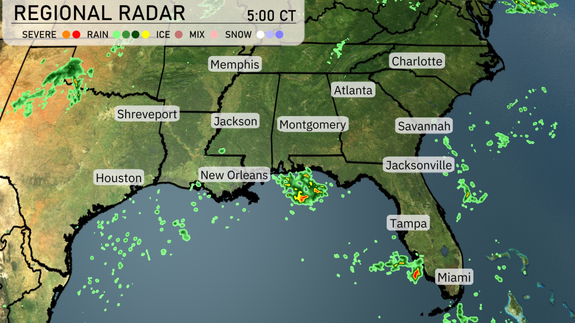 A line of storms is currently stretching from New Orleans over the Gulf of Mexico, with showers extending towards Jacksonville. Scattered rain is depicted around Montgomery, moving into the southeastern part of the United States. Miami is under light rain, while clouds are building toward Atlanta signaling an upcoming change in weather. Central Alabama remains mostly calm, with clouds thickening farther west towards Shreveport.