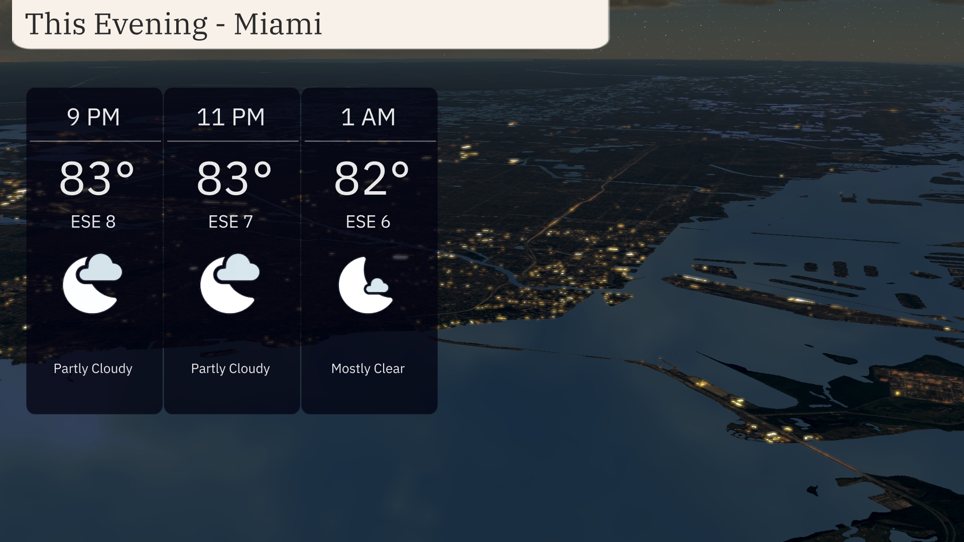 This evening in Miami, anticipate partly cloudy skies transitioning to mostly clear conditions by 1 AM. Temperatures will hold steady at 83 degrees around 9 PM and 11 PM, slightly cooling to 82 degrees at 1 AM. An easterly breeze will persist with winds from the southeast at 8 to 7 miles per hour through the evening.