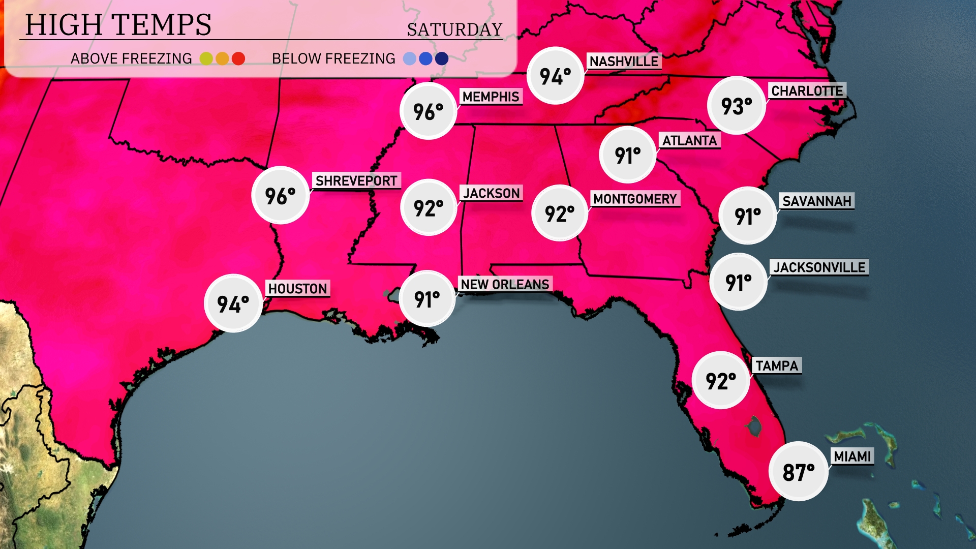 Tomorrow in the Southeast, expect a scorching day with temperatures rising significantly. Memphis is forecasted to reach 96 degrees, while Nashville will hit a high of 94. Shreveport should see a warm 96 degrees and New Orleans will be slightly cooler at 91. In Florida, Jacksonville and Tampa will both see highs of 91 and 92 degrees, respectively, while Miami warms up to 87.