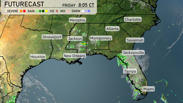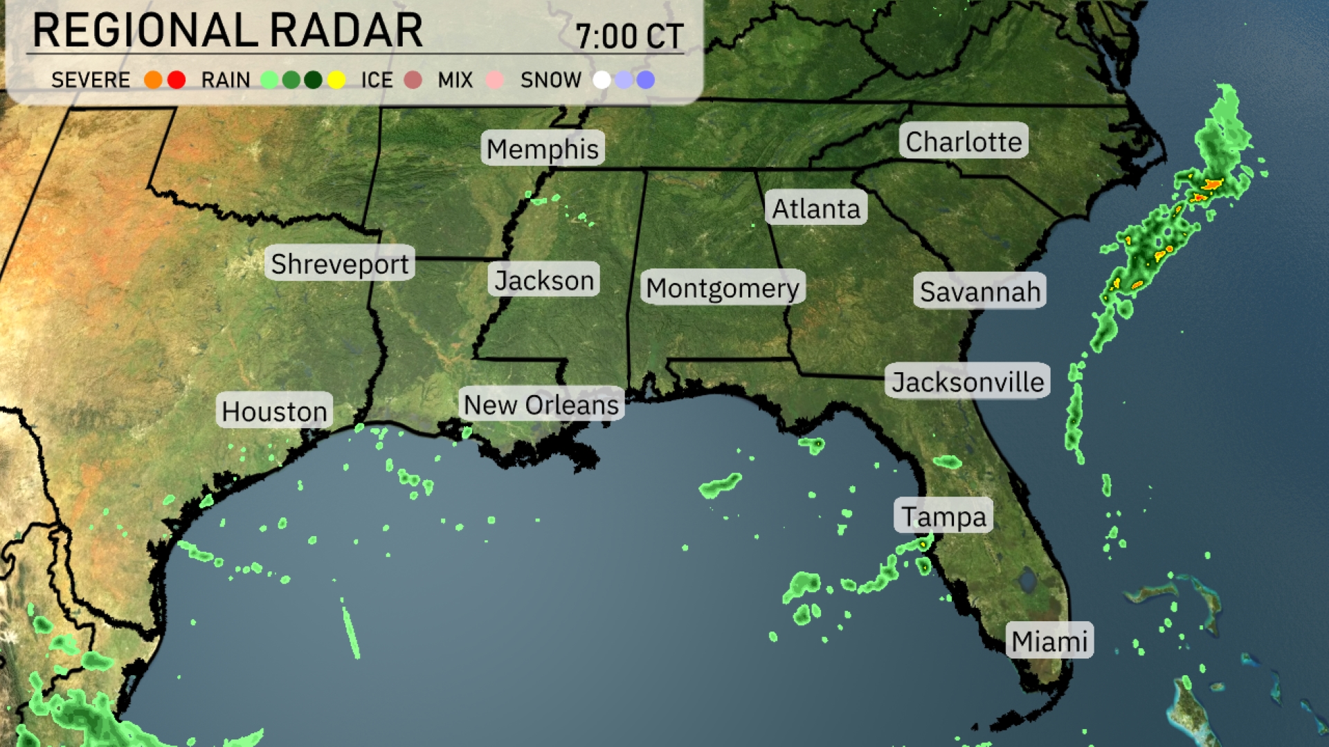 Showers are moving off the west coast of Florida near Tampa and Miami, gently clearing as they head out to sea. A few spotty rain showers can be seen along the Gulf Coast near New Orleans and Houston. Meanwhile, the rest of the Southeast, including cities like Atlanta, Charlotte, and Jackson, enjoys clear skies with expanding sunshine.