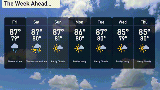 Friday: Expect a high of 87 degrees with evening showers and a low of 79 degrees.