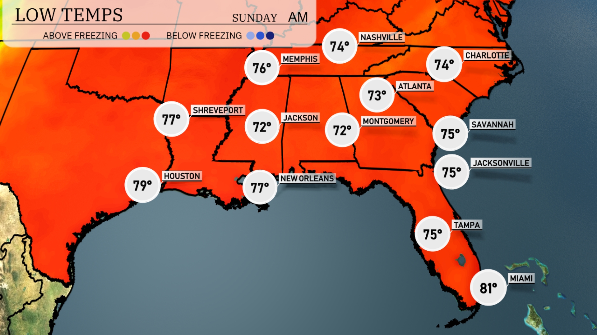 Tonight, temperatures will be on the warmer side across the Southeast. Nashville will cool down to 74 degrees, while Memphis will stay a bit warmer at 76. Expect lows of 72 in both Jackson and Montgomery. Miami remains the warmest city with a comfortable low of 81 degrees.