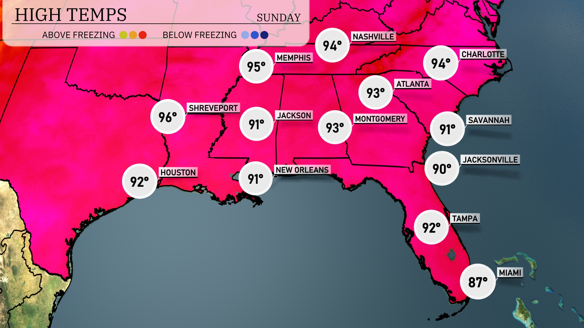 Tomorrow, Shreveport will peak at a scorching 96 degrees, while Houston is expected to see a high of 92. Memphis will reach a warm 95 degrees, and Jackson is slightly cooler at 91. Atlanta is also in the mix with a high of 93, while Montgomery sizzles at 93 as well. In Florida, Tampa will see highs of 92, and Miami is the coolest of the group at 87 degrees, as high pressure dominates the region, leading to above-average temperatures across the Southeast.