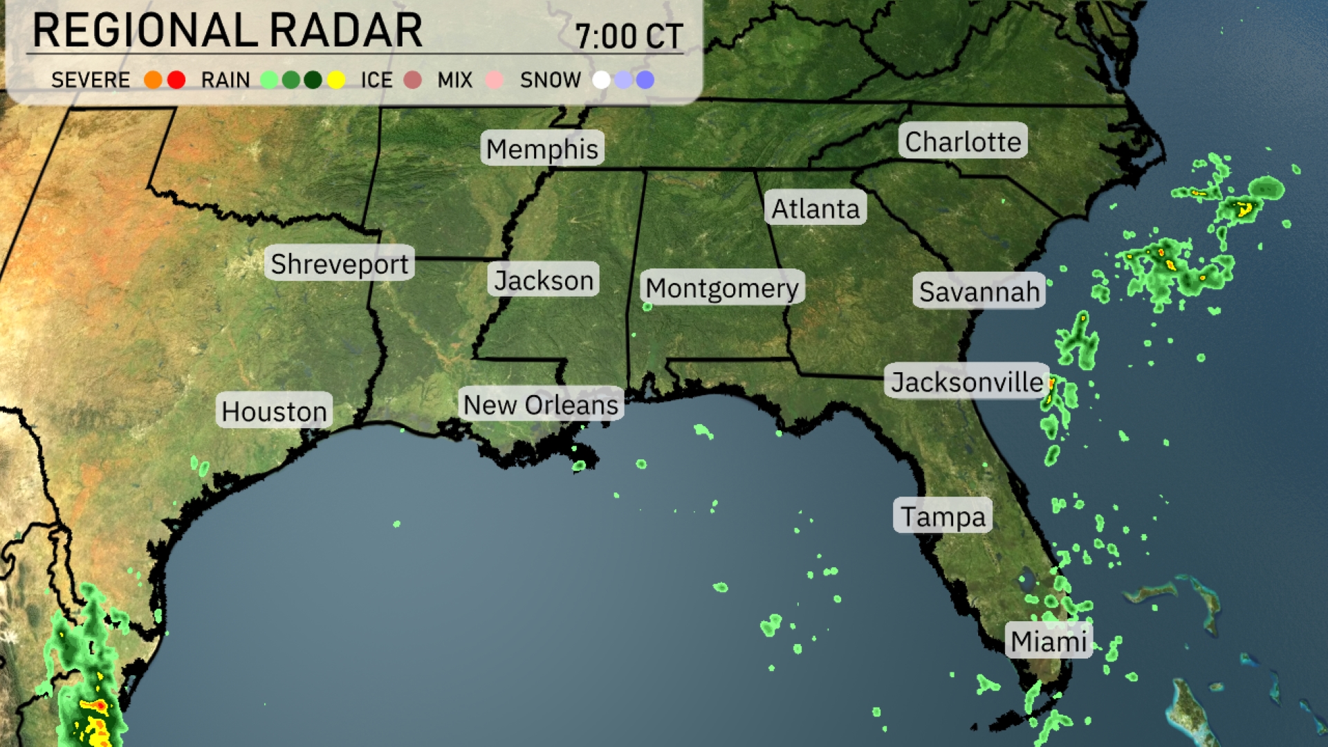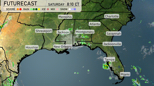 On the regional radar, rain showers are spreading over the northern Gulf Coast from Houston to New Orleans. A trace of showers is beginning to push into the Tallahassee area, heading towards Jacksonville. In Florida, scattered showers are moving off the Atlantic coast near Miami, with more wet weather heading towards Tampa. Across the inland Southeast, from Atlanta to Montgomery, conditions remain relatively clear with only a few scattered clouds.
