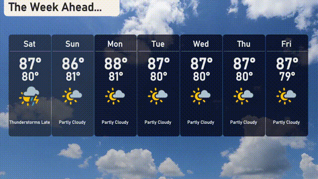 For the 7-day forecast in Miami: Saturday: Thunderstorms are expected late, with a high of 87 degrees and a low of 80 degrees. Sunday: Partly cloudy skies, with a high of 86 degrees and again, a low of 81 degrees. Monday: We continue with partly cloudy conditions, reaching 88 degrees in the afternoon. Tuesday: Mostly sunny, with a high of 87 degrees and overnight temperatures around 80 degrees. Wednesday: Another day of sunshine, with a high of 87 degrees and a low near 80. Thursday: Partly cloudy yet again, peaking at 87 degrees during the day. Friday: The week wraps up with partly cloudy skies and temperatures reaching 87 degrees with a low of 79 degrees.