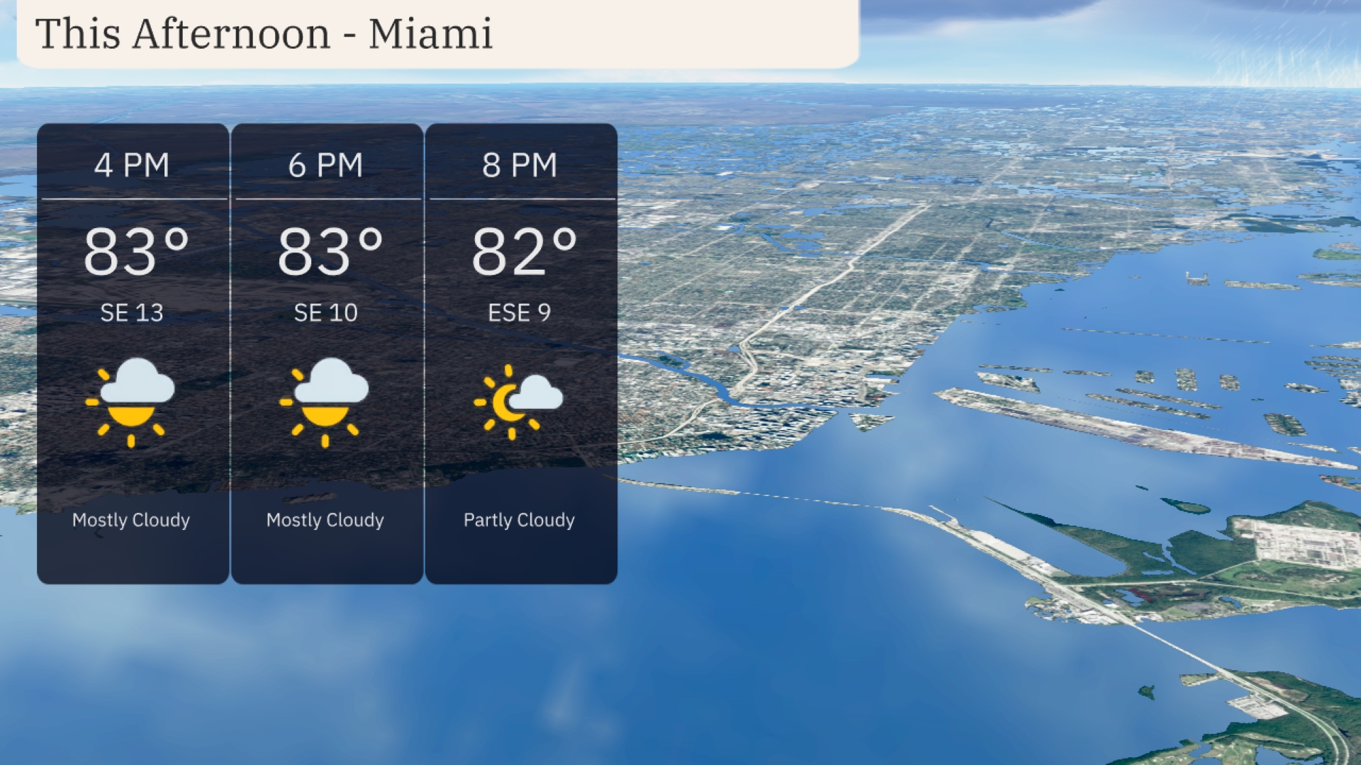 Temperatures in Miami this afternoon will hover around 83 degrees with mostly cloudy skies. Winds are coming from the southeast at 13 miles per hour, providing a gentle breeze. By 6 PM, conditions remain mostly cloudy with temperatures steady at 83 degrees as the southeast wind persists. At 8 PM, expect a slight dip to 82 degrees with partly cloudy skies and a gentle east-southeast wind at 9 miles per hour.