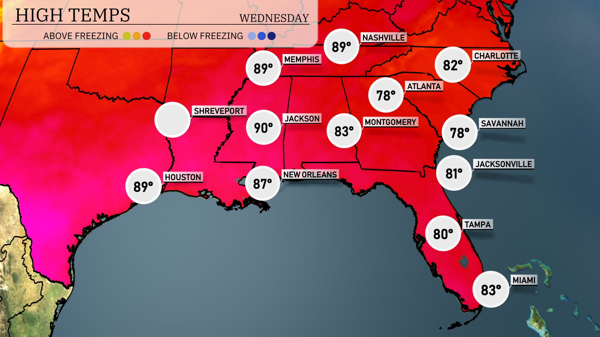 Tonight, Memphis will cool down to 74 degrees. Nashville expects a low of 71. In Jackson, temperatures will drop to 73, while Montgomery will see a low of 71. Atlanta will reach about 67 degrees overnight, a notable cooler trend for the area. Expect Jacksonville to remain mild at 73 degrees, while Miami stays warm at 81.