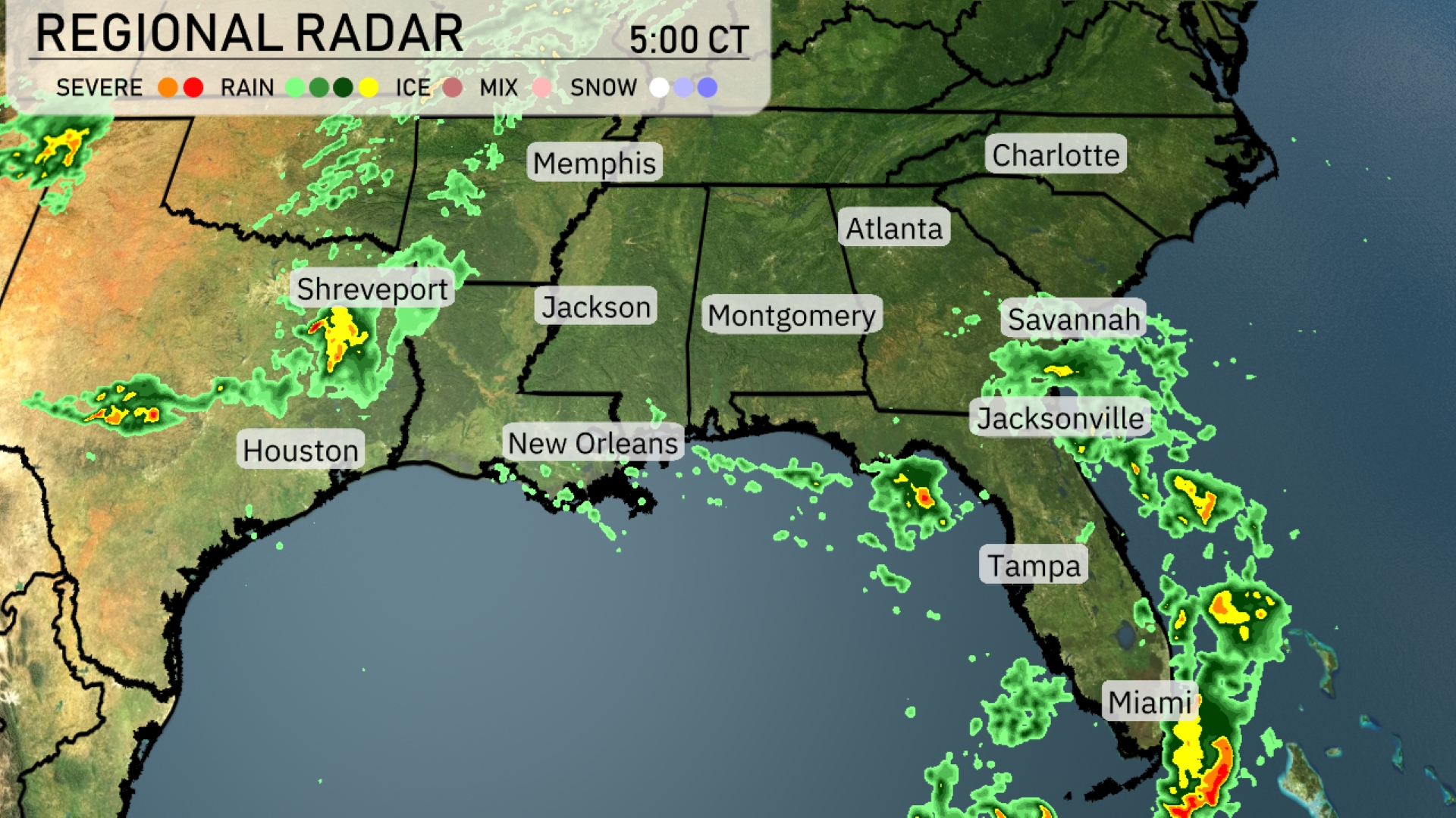 Welcome to your detailed weather rundown with meteorologist Amy Freeze! Miami basks under mostly sunny skies today, but don’t put those umbrellas away yet. Strong storms are sweeping through the north, and the Southeast is bracing for varied weather conditions, from clear skies in some parts to heavy rainfalls in others. Keeping an eye on the sky has never been more intriguing. Catch the daily intricacies of the Southeast weather with temperatures, UV indexes, and much more! 🌤️🌦️🌩️ On the Regional Radar, strong storms are seen north of Shreveport, moving to the northeast. In the Gulf of Mexico, bands of rain are pushing onto the Florida peninsula, especially near Tampa and Miami, bringing wet conditions. Jacksonville is also experiencing rain, with heavier showers moving inland. In Houston and New Orleans, relatively clear conditions are prevailing, while Montgomery and Charlotte enjoy dry weather with increasing cloudiness.
