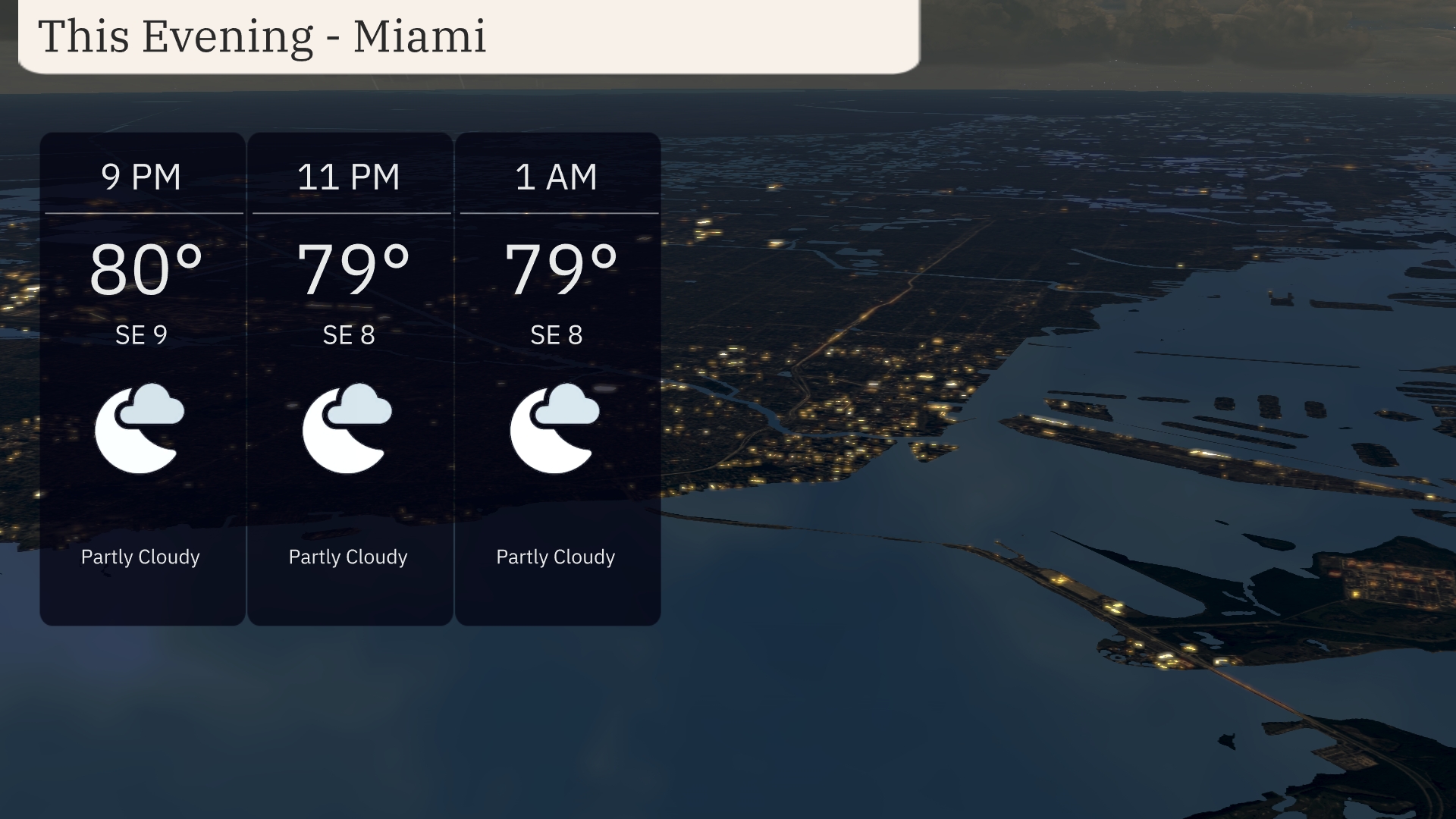 For this evening in Miami, expect partly cloudy skies with temperatures steady at 80 degrees at 9 PM, and slightly cooling to 79 degrees by 11 PM and maintaining through 1 AM. Winds will blow from the southeast at around 9 miles per hour, decreasing slightly to 8 miles per hour later in the night.
