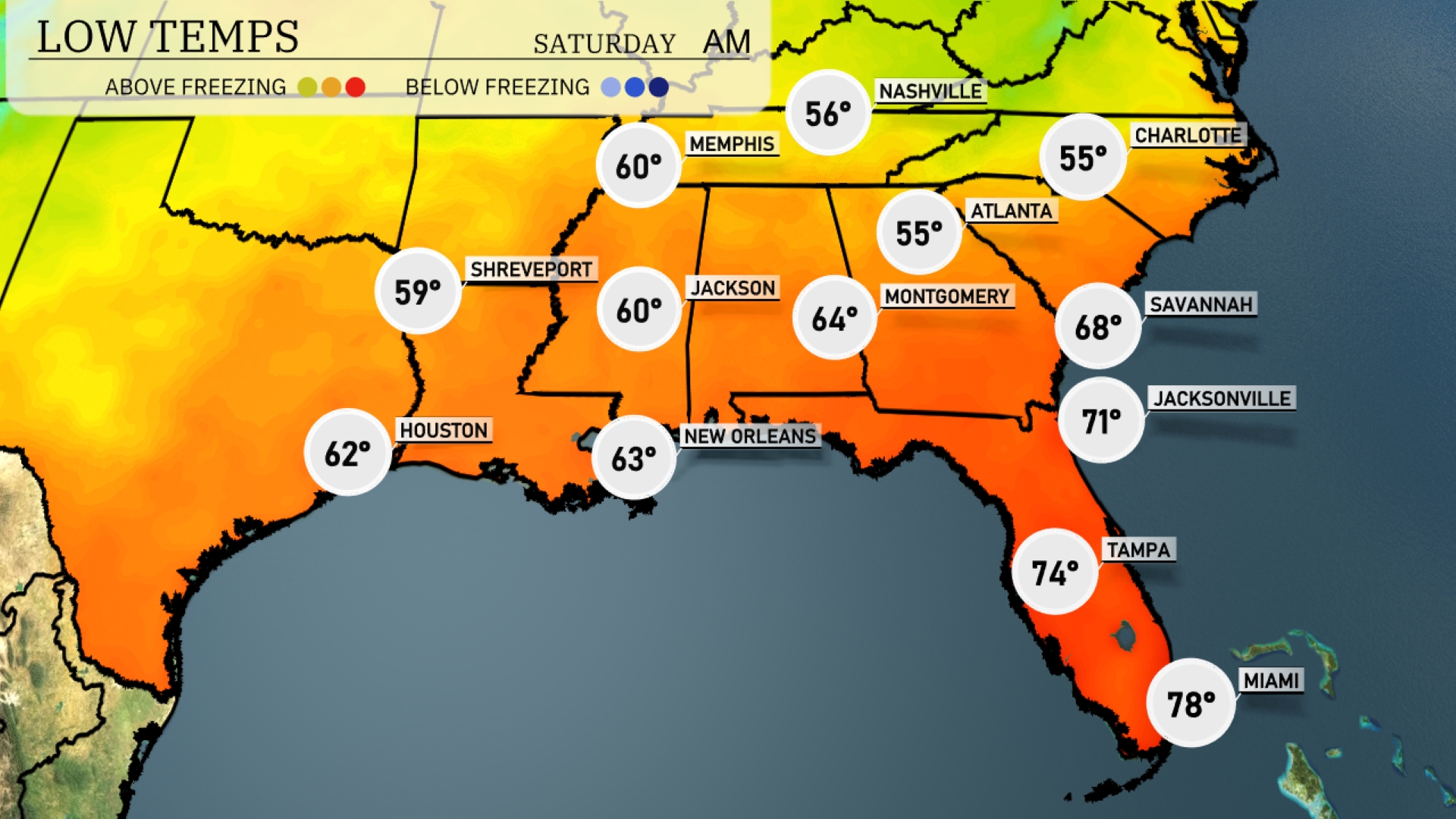 The Southeast is bracing for cooler overnight lows, with temperatures dropping significantly in key cities. Expect 55 degrees in Atlanta and 56 in Nashville, both showing notable decreases from previous nights. Montgomery will drop to 64 degrees, while Jackson sits at 60. To the south, New Orleans will see a low of 63 degrees, and Shreveport is projected to fall to 59. While Tampa will remain milder at 74 degrees, the overall trend indicates a notable chill settling over the region tonight.