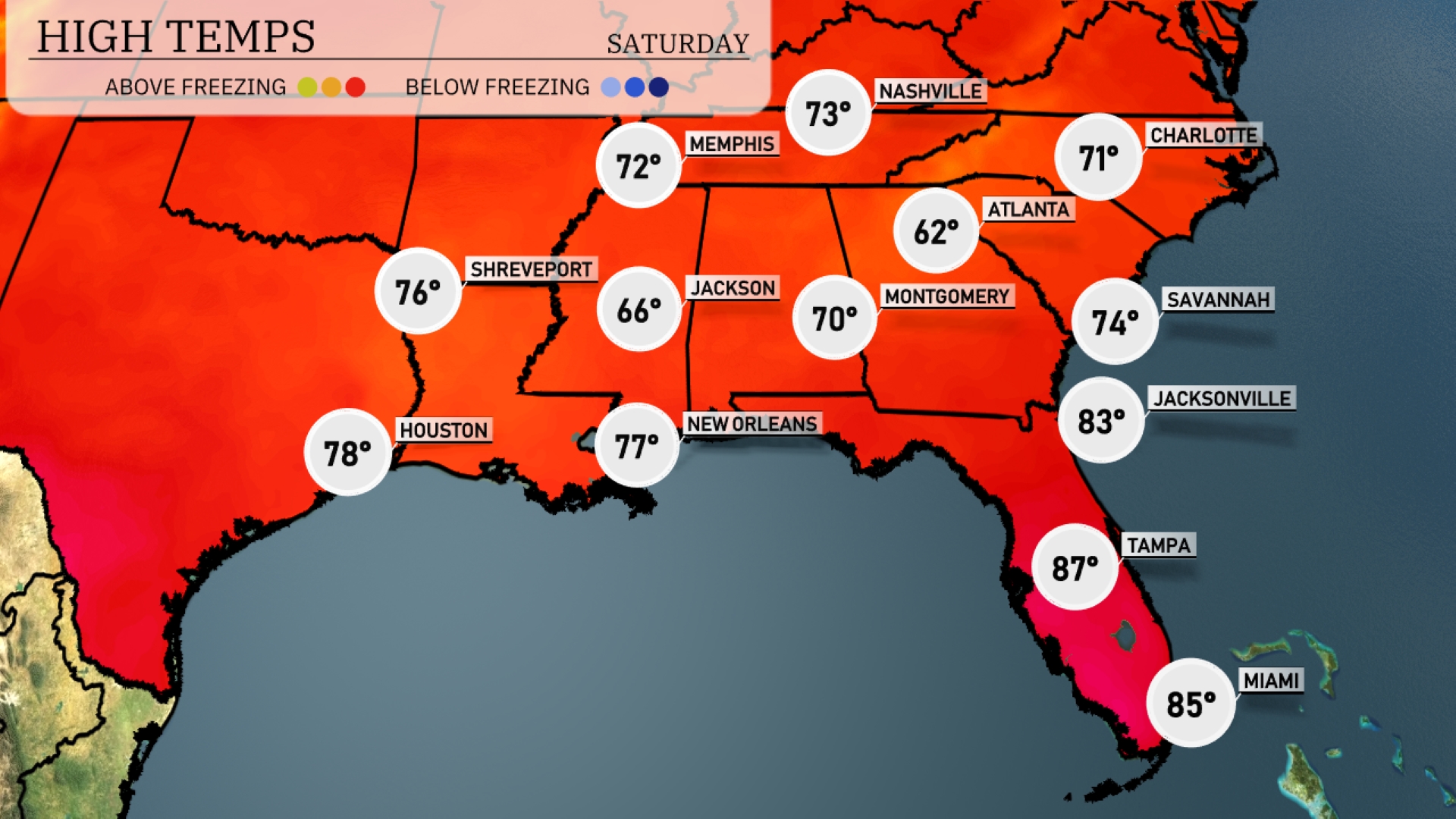 High temperatures tomorrow in the Southeast will be warming significantly above average. Atlanta expects a high of 70 degrees, while Jackson is a bit cooler at 66. New Orleans will see a pleasant 77 degrees, and further down in Florida, Tampa is set to reach 87 degrees, closely followed by Miami at 85. Jacksonville is poised for a warm 83 degrees, highlighting a trend of rising temperatures as we move into spring.