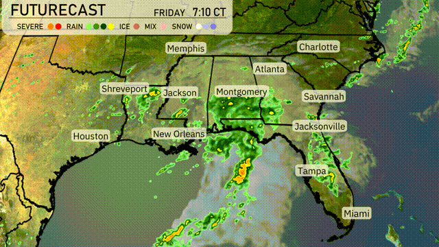 Expect an active weather day across the Southeast tomorrow. A significant cold front will sweep from the western to eastern parts of the region. Heavy rain and thunderstorms, especially from New Orleans to Montgomery, could cause brief flooding and dangerous travel conditions. Areas from Jackson to Jacksonville should prepare for severe weather, including strong gusty winds and isolated tornadoes during the day.