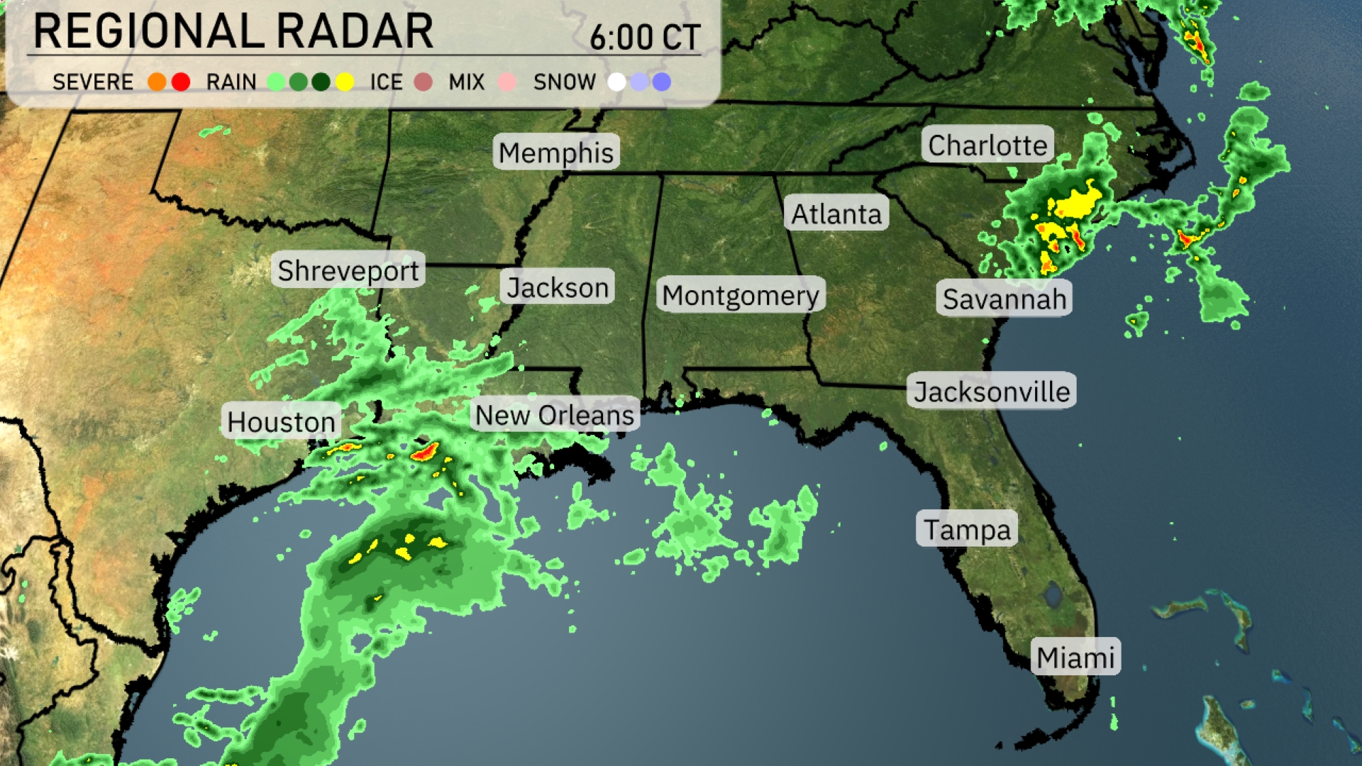 The Regional Radar shows a significant weather system affecting the Southeast. Intense thunderstorms are developing in the Gulf of Mexico, moving towards Houston and New Orleans. Shreveport and Jackson are experiencing consistent rain as the system progresses eastward. Light rain is also beginning to spread into the Montgomery area. The Carolinas, including Charlotte, are seeing scattered showers with potential for increased precipitation.