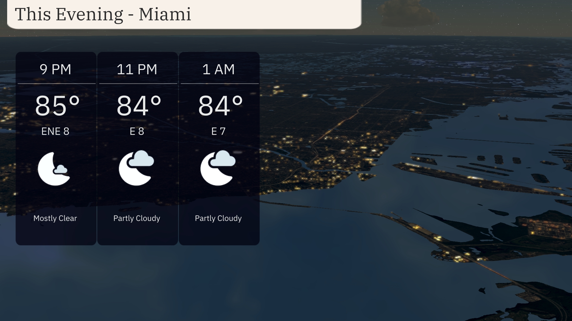 For this evening in Miami, temperatures will hover around 85 degrees at 9 PM, slightly cooling to 84 degrees by 1 AM. Expect mostly clear to partly cloudy skies, providing a pleasant night backdrop. Winds will be gentle from the east-northeast at 8 mph, shifting to an eastward direction at 7 mph by late night. The steady breeze should keep the atmosphere refreshing as you enjoy the evening.